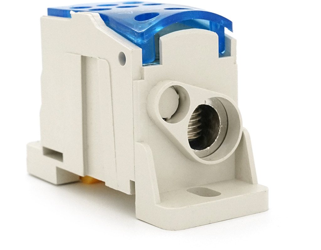 Паралельний розгалужувач-спліттер проводів UKK125A, 6 виходів(латунь) 6х16мм2*1х35 / 1х16мм2, AC690V, 125А, 66*45*29,3мм, BLUE