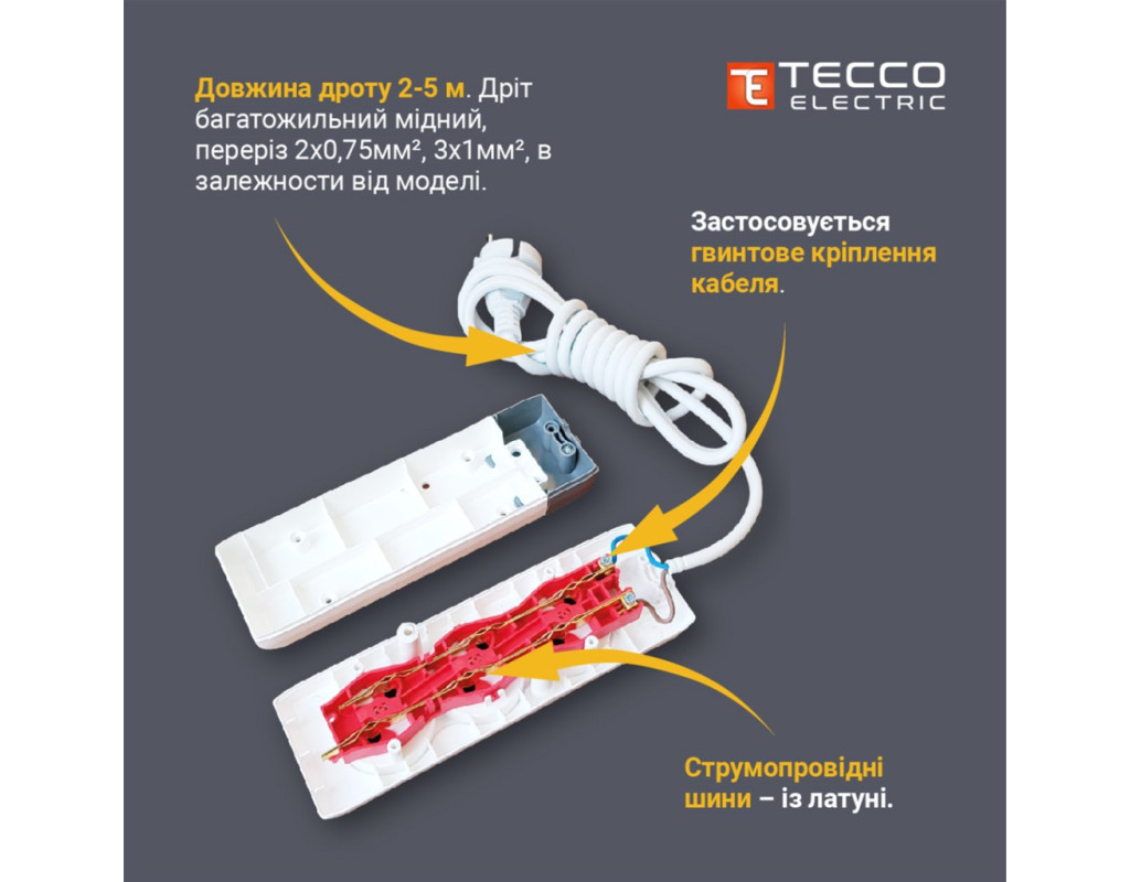Подовжувачі TECCO призначені для одночасного підключення до електромережі різноманітних приладів — це оптимальний вибір для забезпечення надійного контакту, захисту від дотику до струмопровідних шин, надійної та безперебійної роботи з електричною мережею. Призначені для внутрішніх мереж змінного струму, напругою до 250 В — побутова та офісна техніка, професійний та побутовий електроінструмент, освітлювальні прилади та ін. Корпус виготовлено із міцного поліпропілену, що характеризується високою ударною міцністю, зносостійкістю, високими діелектричними показниками. Всередині спеціальний блок червоного кольору з матеріалу, що не підтримує горіння (захист до 850⁰ С), який служить опорною оболонкою для контактних груп і захищає виріб від перегріву та термічного руйнування в аварійних ситуаціях.