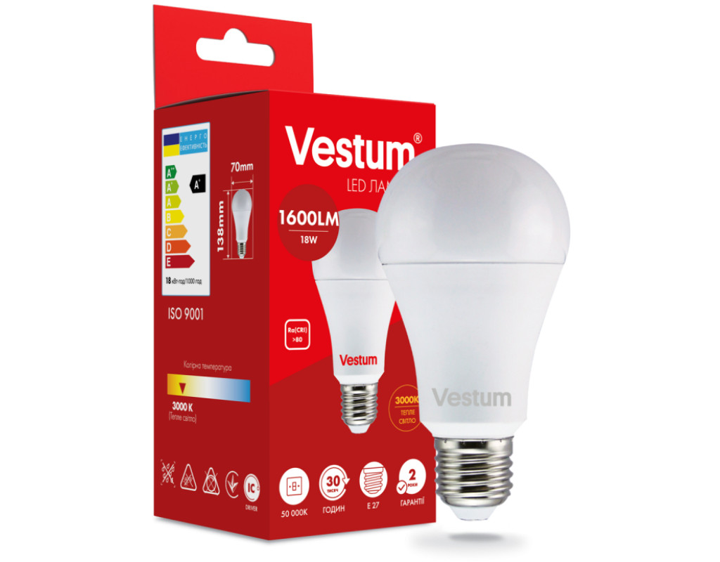 Світлодіодна лампа Vestum 1-VS-1112 потужністю 18 Вт дає 1600 Лм. Споживаючи в рази менше електрики, ніж лампи розжарювання або люмінесцентні лампи, вона дає таку ж кількість світла і прослужить в кілька разів довше. Лампа має тепле світло, що робить її підходящою для спалень, дитячих та настільних ламп. Стандартний цоколь E27 підходить для люстр, торшерів, настільних ламп і настінних світильників.