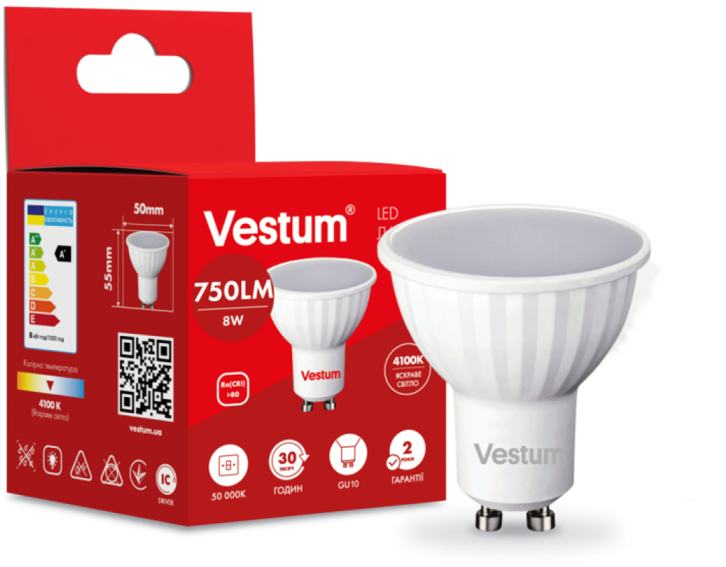 Світлодіодна лампа Vestum 1-VS-1508 потужністю 8 Вт дає 750 Лм. Споживаючи в рази менше електрики, ніж лампи розжарювання або люмінесцентні лампи, вона дає таку ж кількість світла і прослужить в кілька разів довше. Лампа має нейтральне світло, що робить її підходящою для кабінету, кухні, коридору або ванної. Цоколь GU10 підходить для точкових світильників.
