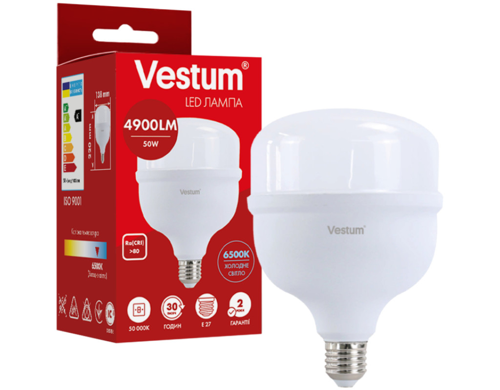 Світлодіодна високопотужна лампа Vestum 1-VS-1610 на 50 Вт видає 4900 Лм. Споживаючи в рази менше електрики, ніж лампи розжарювання або люмінесцентні лампи, вона дає таку ж кількість світла і прослужить в кілька разів довше. Лампа має холодне світло, що робить її придатною для промислових приміщень і вуличних світильників. У лампі використовується стандартний цоколь Е27.