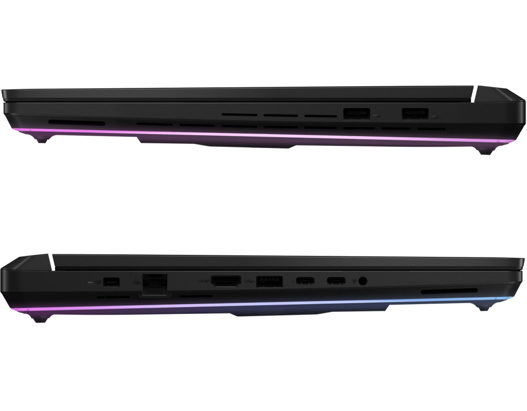 - Повний набір портів. Наявність різноманітних портів дозволяє підключити до ноутбука мишу, гарнітуру, зовнішній монітор тощо, тому Strix SCAR 16 отримав максимально широкий набір таких інтерфейсних портів. На його правій грані розташовано два порти USB-A, а на лівій – більшість інших роз'ємів: аудіороз'єм, два порти Thunderbolt 5 (USB Type-C), один порт USB-A, HDMI 2.1, порт Ethernet 2,5 Гбіт/с і порт живлення. Якщо уявити собі ідеальну бойову станцію, то Strix SCAR 16 – це її втілення в реальність