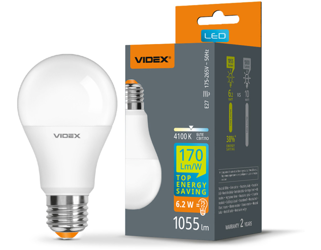Спеціальна високоефективна лампочка VIDEX A60h 6.2W E27 4100K служить для заміни звичайного освітлення в різних складських приміщеннях і виробничих комплексів, зовнішнього освітлення. Колірна температура - 4100К (нейтральне світло). Кут розсіювання світла - 300°, що дозволяє якісно освітити приміщення. Лампа має світловіддачу - 170Лм/Вт. Сумарна сила світлового потоку у лампи VIDEX становить 1055Лм. Переваги