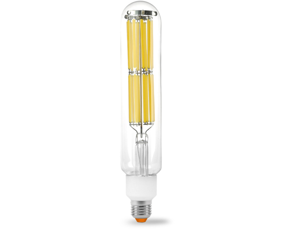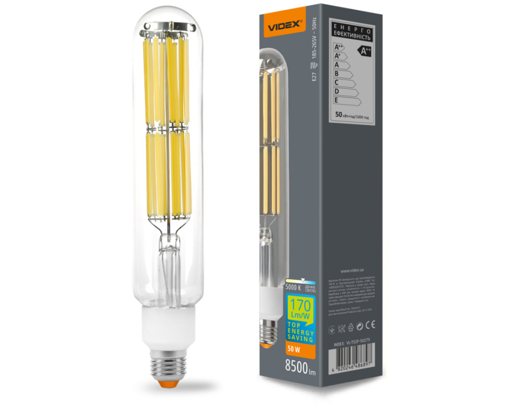 Високопотужна LED лампа VIDEX Filament T52F 50W E27 5000K забезпечує рівний світловий потік і максимальну яскравість з першої секунди роботи. Дана модель є високоефективною, адже навіть у порівнянні зі звичайними світлодіодними лампами вона має кращу світловіддачу і меншу потужність, тому і є ефективніша. Завдяки використанню такої лампи ви зможете додатково заощаджувати на витратах електроенергії. Лампа не має відчутного для людського ока ефекту мерехтіння. Сумісна з більшістю вимикачів з нічним підсвічуванням. Лампа підходить для освітлення житлових і комерційних приміщень, офісів. Корпус виконаний зі скла, що робить лампу вразливою до падіння і ударів. Лампа призначена для роботи у побутових мережах змінного струму зі стандартною напругою 220В 50/60Гц. Особливості: