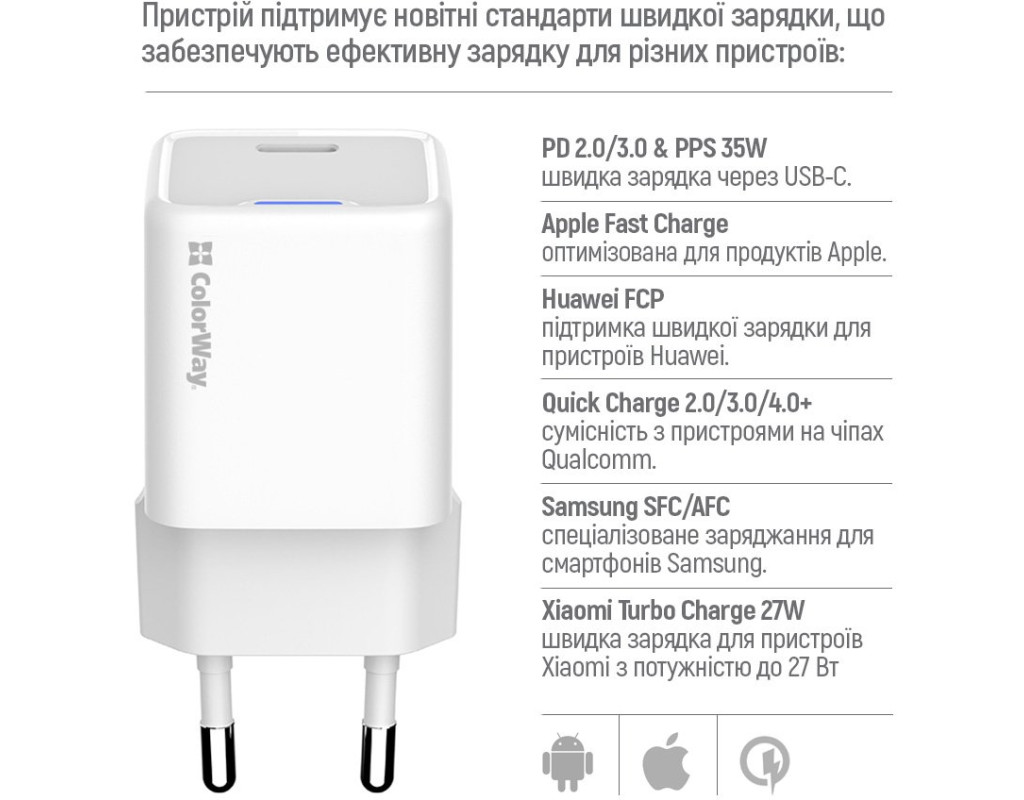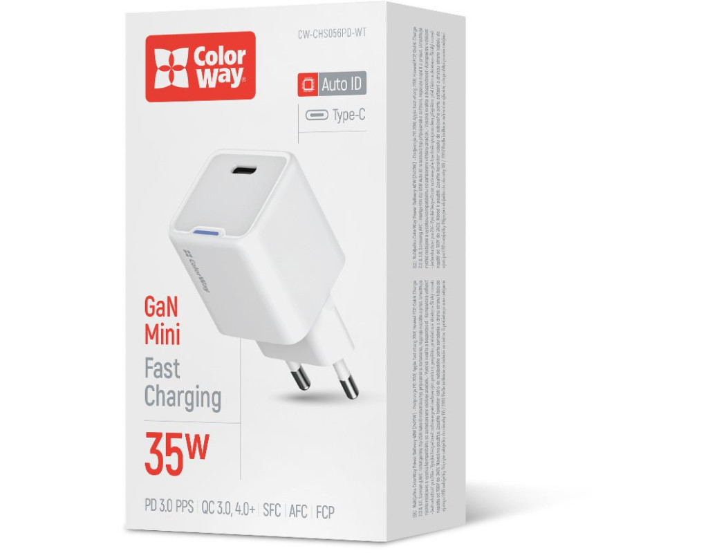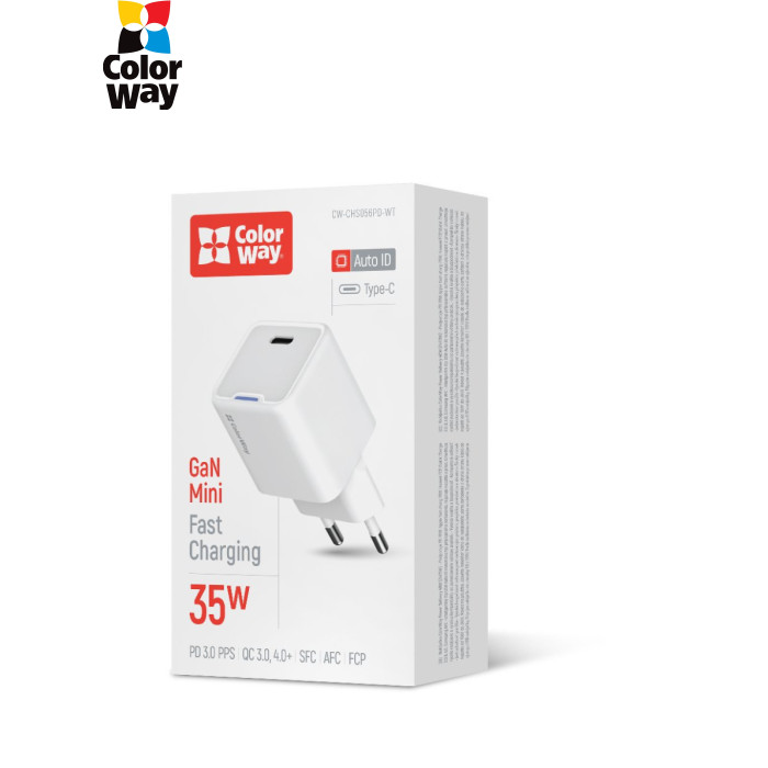 | Мережевий зарядний пристрій 35W PD Port PPS USB-C — це сучасний, компактний і потужний адаптер, що підтримує передові технології швидкої зарядки: Xiaomi Turbo Charge 27W, Apple Fast Charge, PD 2.0 & 3.0 PPS 35W,Huawei FCP, Quick Charge 2.0/3.0/4.0+, Samsung SFC/AFC з вихідною потужністю до 35 Вт. Компактний розмір та ергономічний дизайн роблять цей зарядний пристрій ідеальним для повсякденного використання й подорожей. Завдяки технології GaN (нітрид галію) пристрій став легшим, меншим та ефективнішим у порівнянні зі звичайними адаптерами. Colorway GaN Mini майже не нагрівається під час роботи, споживає менше енергії і значно прискорює зарядку пристроїв. Інтелектуальна мікросхема USB Auto ID автоматично розпізнає підключений пристрій та підбирає оптимальну напругу й силу струму до 3A, що забезпечує максимально ефективне заряджання. Пристрій є сумісним із більшістю сучасних брендів смартфонів, планшетів та інших гаджетів. Додатково адаптер оснащений системою багаторівневого захисту: від короткого замикання, перегріву, перенапруги й перевантажень по струму. Корпус, виготовлений із вогнестійкого ABS-пластику, відрізняється стійкістю до подряпин та ударів, забезпечуючи надійність і тривалий термін служби навіть за інтенсивного використання. Завдяки компактним розмірам і малій вазі пристрій легко поміщається в кишеню чи сумку, що робить його зручним для транспортування.
