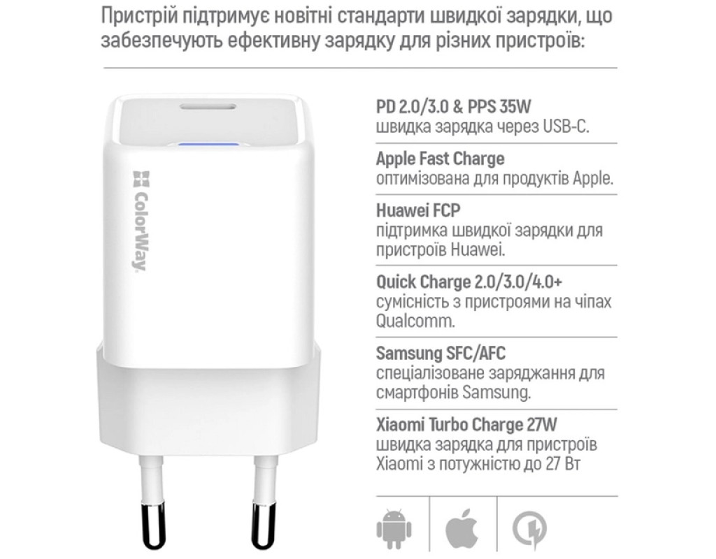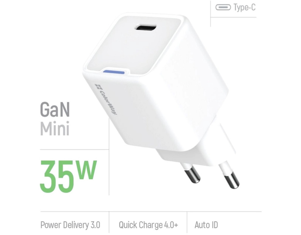 | Зарядний пристрій ColorWay GaN Mini 35W PD Port PPS USB-C white (CW-CHS056PD-WT) втілює поєднання передових технологій та незмінної якості. Завдяки використанню нітрид галію (GaN), цей адаптер забезпечує високу енергоефективність, дозволяючи заряджати вашу техніку швидше та ефективніше, ніж будь-коли раніше. Це незамінний гаджет для тих, хто цінує мобільність і продуктивність у будь-якій ситуації. З потужністю виходу до 35 Вт і підтримкою різних стандартів швидкої зарядки, включаючи Quick Charge 3.0, Power Delivery 2.0, Power Delivery 3.0 та Programmable Power Supply (PPS), цей пристрій ідеально підходить для зарядки низки гаджетів. Від смартфонів та планшетів до фітнес-браслетів та екшн-камер, ви можете бути впевнені в наявності достатньої потужності для будь-якої задачі. Його єдиний USB Type-C порт з вихідним струмом 3 А гарантує максимальну швидкість і ефективність зарядки. Інтелектуальна мікросхема USB Auto ID автоматично визначає підключений пристрій і регулює параметри заряджання для оптимальної продуктивності, одночасно запобігаючи перегріву та перепадам потужності. За продуктивність адаптера відповідає вогнестійкий ABS-пластик, який є стійким до подряпин і ударів, що значно підвищує його довговічність. Завдяки компактним розмірам, зарядний пристрій легко поміститься в будь-якій кишені або сумці, стаючи ідеальним вибором в поїздках або щоденних подорожах. ColorWay GaN Mini — це вибір для тих, хто не бажає йти на компроміс з якістю, надійністю та швидкістю зарядки, незалежно від того, де ви перебуваєте. Придбайте цей зарядний пристрій, щоб забезпечити надійну підтримку ваших гаджетів у всіх умовах! |