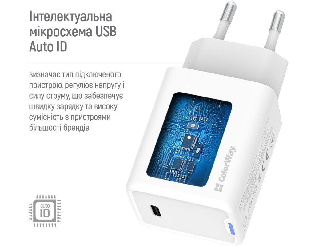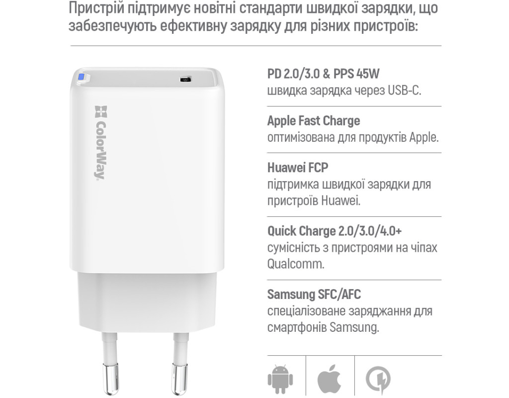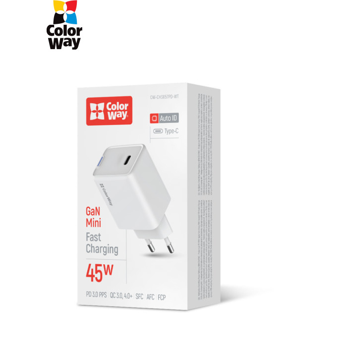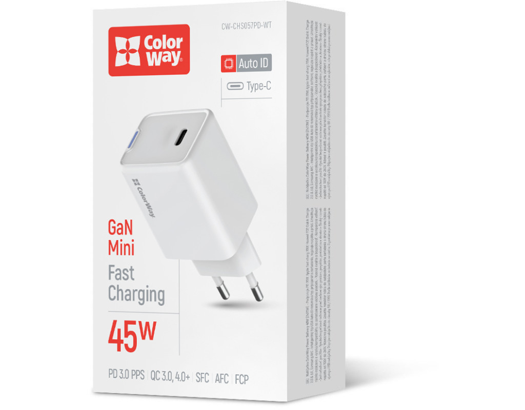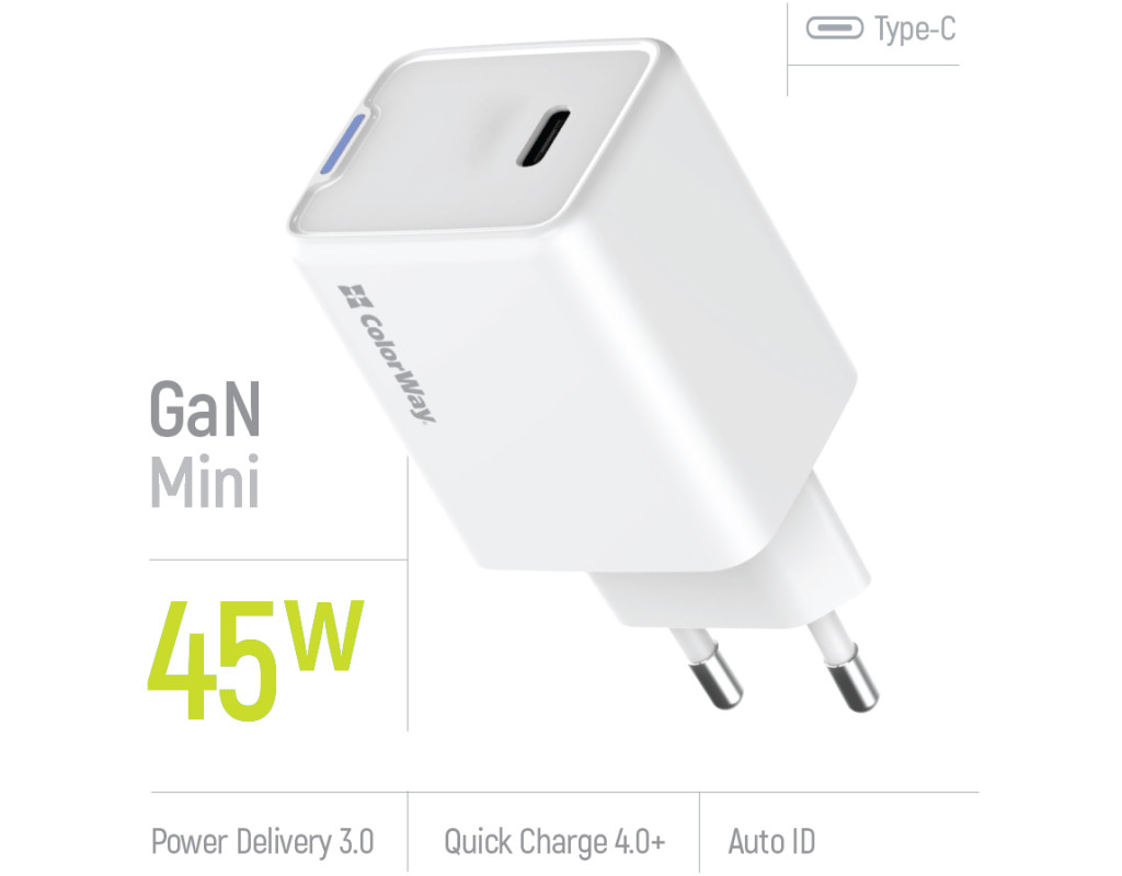 | Мережевий зарядний пристрій 45W PD Port PPS USB-C белое — це сучасний, компактний і потужний адаптер, що підтримує передові технології швидкої зарядки:Apple Fast Charge, PD 2.0 & 3.0 PPS 45W,Huawei FCP, Quick Charge 2.0/3.0/4.0+, Samsung SFC/AFC з вихідною потужністю до 45 Вт. Компактний розмір та ергономічний дизайн роблять цей зарядний пристрій ідеальним для повсякденного використання й подорожей. Завдяки технології GaN (нітрид галію) пристрій став легшим, меншим та ефективнішим у порівнянні зі звичайними адаптерами. Colorway GaN Mini майже не нагрівається під час роботи, споживає менше енергії і значно прискорює зарядку пристроїв. Інтелектуальна мікросхема USB Auto ID автоматично розпізнає підключений пристрій та підбирає оптимальну напругу й силу струму до 4A, що забезпечує максимально ефективне заряджання. Пристрій є сумісним із більшістю сучасних брендів смартфонів, планшетів та інших гаджетів. Додатково адаптер оснащений системою багаторівневого захисту: від короткого замикання, перегріву, перенапруги й перевантажень по струму. Корпус, виготовлений із вогнестійкого ABS-пластику, відрізняється стійкістю до подряпин та ударів, забезпечуючи надійність і тривалий термін служби навіть за інтенсивного використання. Завдяки компактним розмірам і малій вазі пристрій легко поміщається в кишеню чи сумку, що робить його зручним для транспортування. Colorway GaN Mini — ідеальний вибір для швидкого та безпечного заряджання ваших пристроїв як вдома, так і під час подорожей
