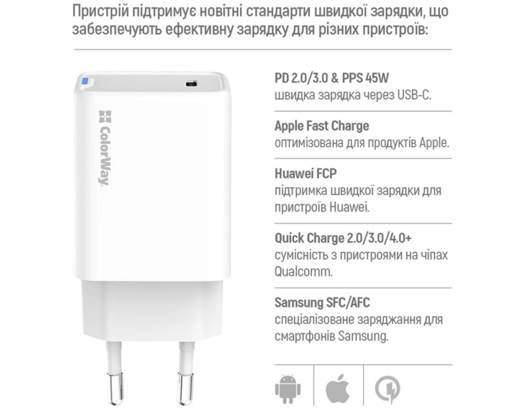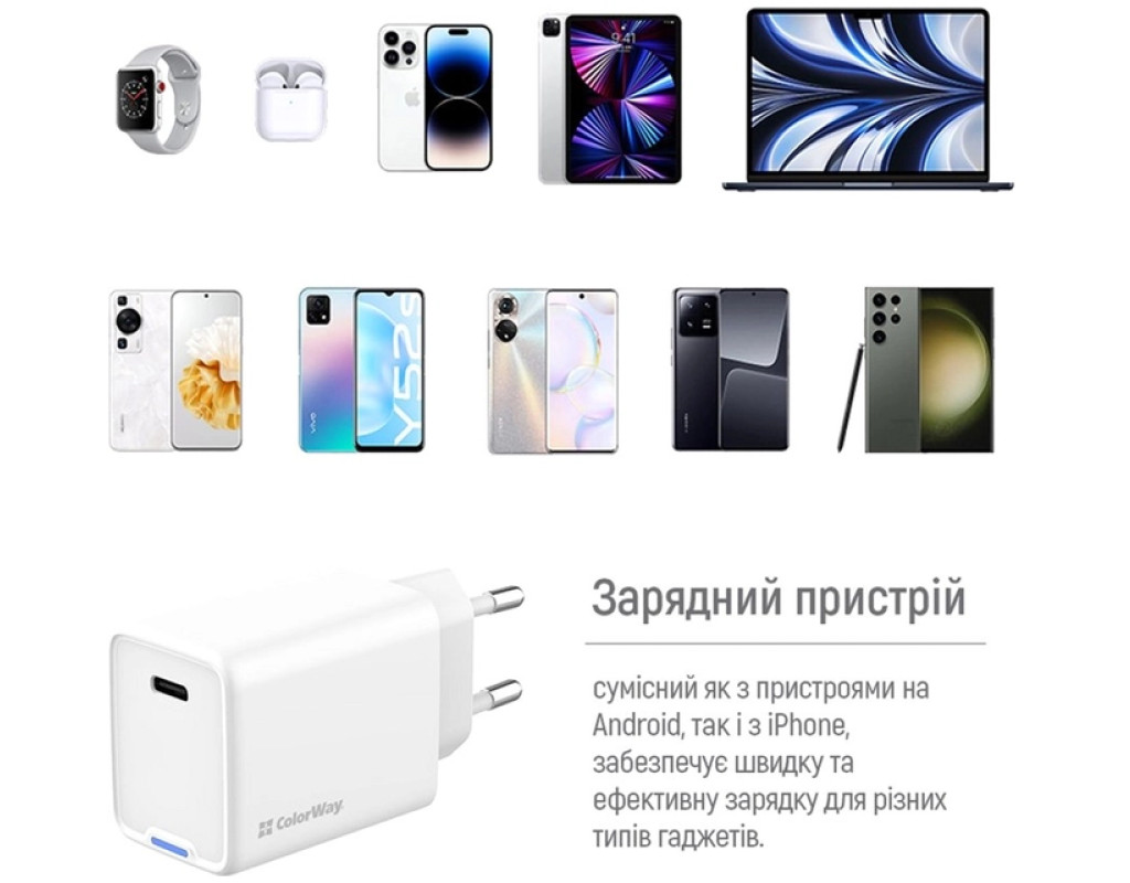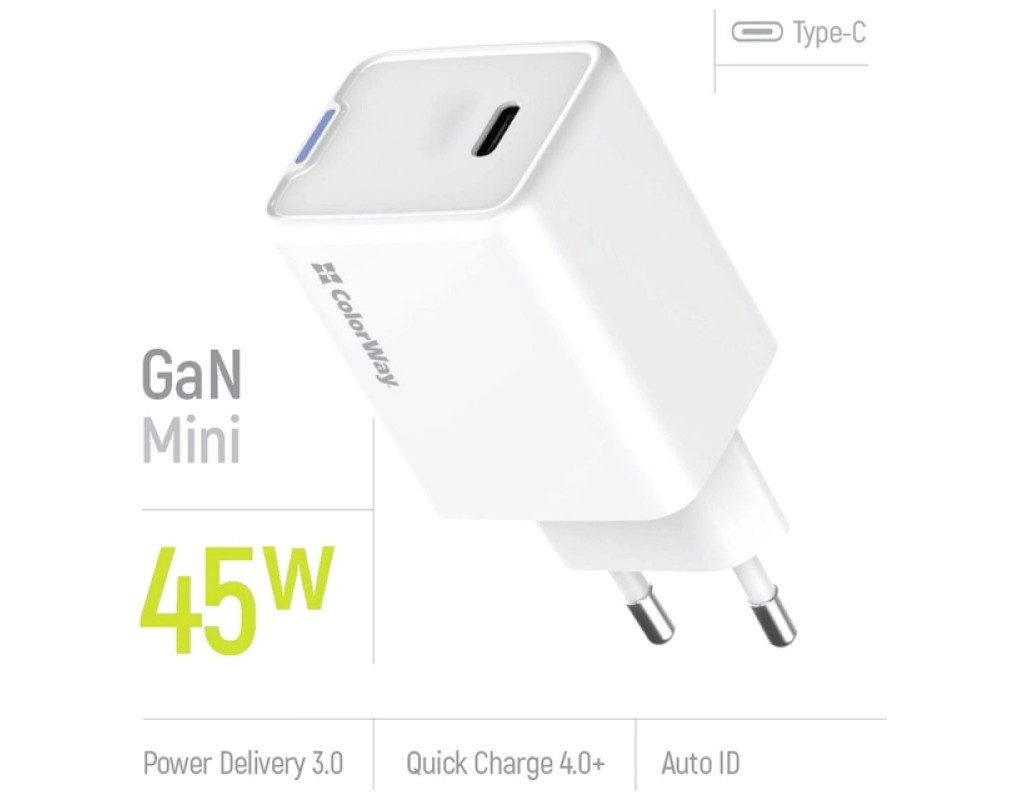 | Зарядний пристрій ColorWay GaN Mini 45W PD Port PPS USB-C white (CW-CHS057PD-WT) — це нове слово в світі зарядних технологій, об'єднуючи інноваційну продуктивність та портативність. Цей адаптер, який працює від мережі, стане універсальним рішенням для заряджання смартфонів, смарт годинників, фітнес-браслетів, екшн-камер, TWS навушників та геймпадів. Одна зарядка — максимум енергії! Його обладнано революційною технологією GaN (нітрид галію), що робить пристрій компактнішим, легшим і ефективнішим, ніж традиційні аналоги. Максимальна вихідна потужність пристрою становить 45 Вт з вихідним струмом до 3А через єдиний USB Type-C порт. Підтримка різноманітних швидкісних протоколів зарядки, включно з Quick Charge 3.0, Power Delivery 2.0 і 3.0, Quick Charge 4.0 та Programmable PowerSupply (PPS), гарантує високу швидкість заряджання для всіх ваших пристроїв. Інтелектуальна мікросхема USB Auto ID автоматично налаштовує оптимальні параметри заряджання для кожного пристрою, забезпечуючи безпечну і швидку передачу енергії. Мультифункціональний захист включає захист від короткого замикання, перегріву, перенапруги і перевантажень струмом, що зберігає ваші гаджети в безпеці. Корпус з вогнестійкого ABS-пластику відрізняється довговічністю і стійкістю до пошкоджень. Компактні розміри роблять його ідеальним супутником у подорожах і буденних справах. Оберіть ColorWay GaN Mini для зручного, швидкого та надійного заряджання ваших улюблених пристроїв у будь-якому місці. |