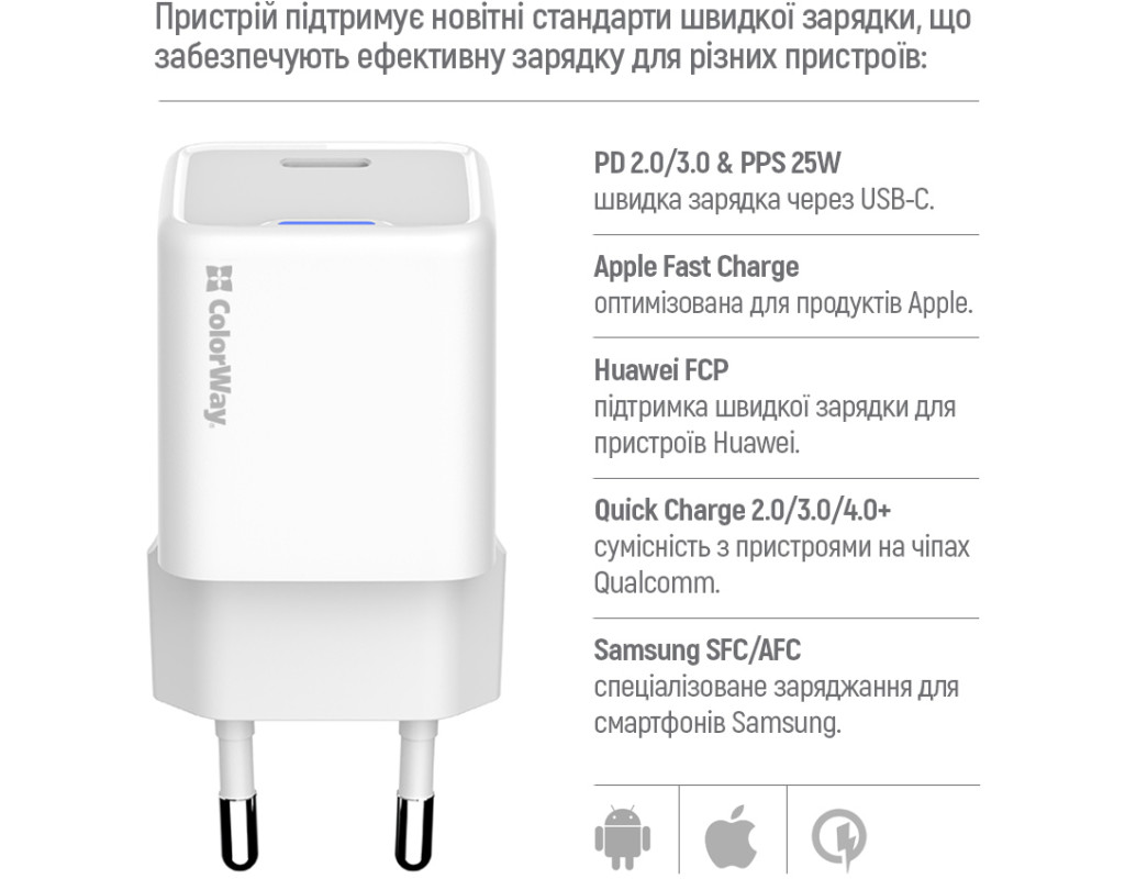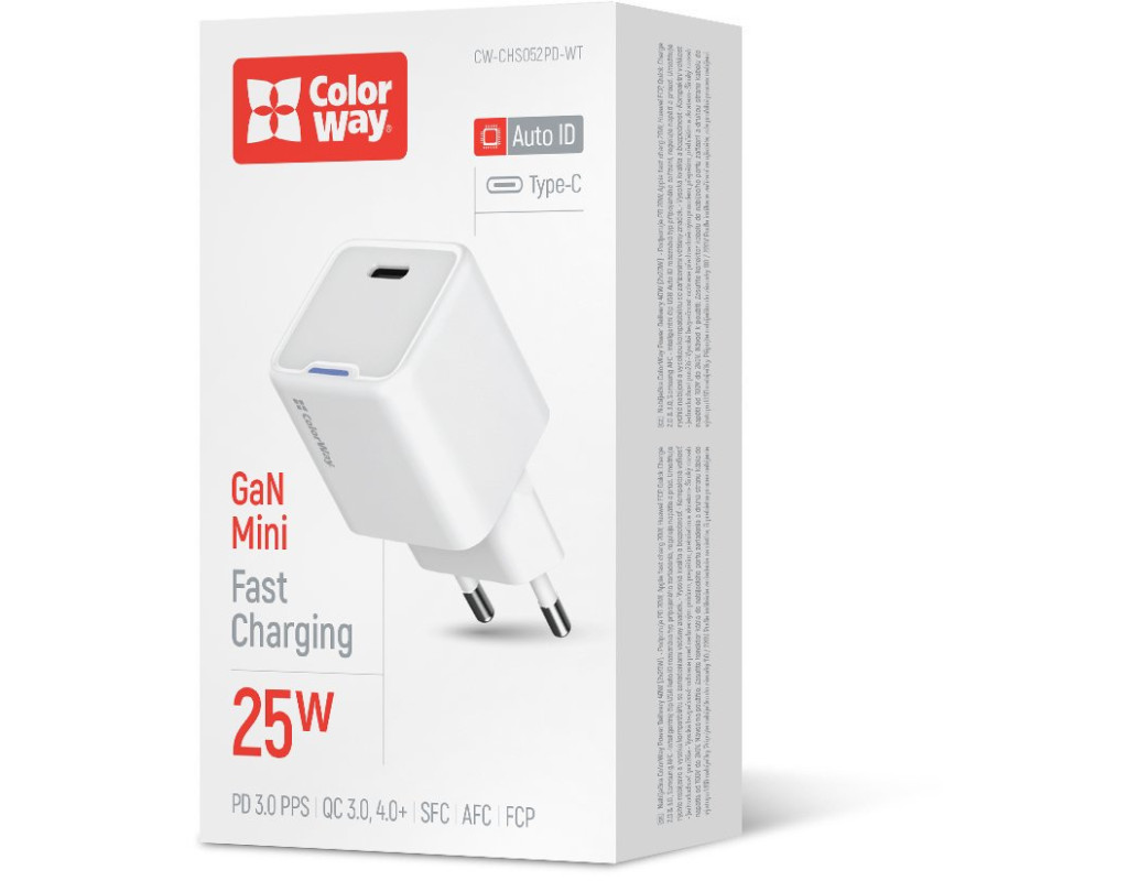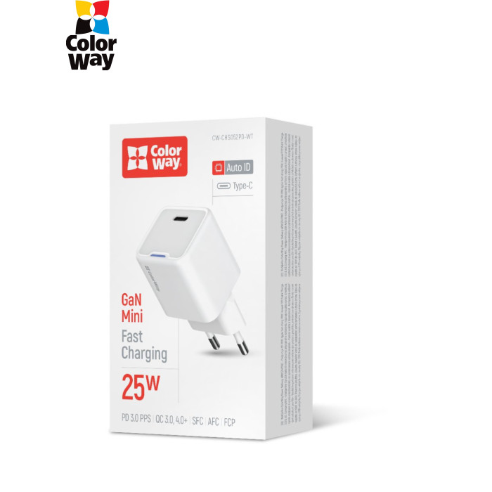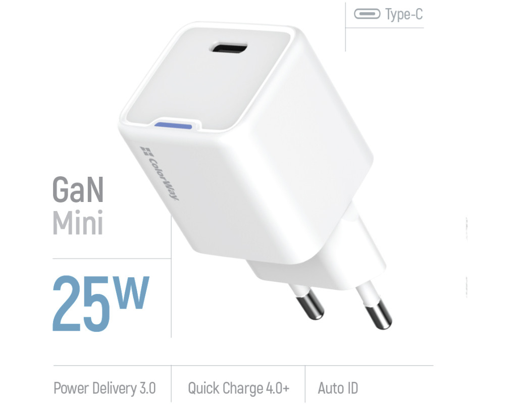 | Мережевий зарядний пристрій Colorway GaN Mini 25W PD Port PPS USB-C — це сучасний, компактний і потужний адаптер, що підтримує передові технології швидкої зарядки: Super Fast Charging PD 3.0 25W PPS, Apple Fast Charge, PD 2.0 & 3.0 PPS 25W, Huawei FCP, Quick Charge 2.0/3.0/4.0+, а також Samsung AFC вихідною потужністю до 25 Вт Компактний розмір та ергономічний дизайн роблять цей зарядний пристрій ідеальним для повсякденного використання й подорожей. Завдяки технології GaN (нітрид галію) пристрій став легшим, меншим та ефективнішим у порівнянні зі звичайними адаптерами. Colorway GaN Mini майже не нагрівається під час роботи, споживає менше енергії і значно прискорює зарядку пристроїв. Інтелектуальна мікросхема USB Auto ID автоматично розпізнає підключений пристрій та підбирає оптимальну напругу й силу струму до 3A, що забезпечує максимально ефективне заряджання. Пристрій є сумісним із більшістю сучасних брендів смартфонів, планшетів та інших гаджетів. Додатково адаптер оснащений системою багаторівневого захисту: від короткого замикання, перегріву, перенапруги й перевантажень по струму.Корпус, виготовлений із вогнестійкого ABS-пластику, відрізняється стійкістю до подряпин та ударів, забезпечуючи надійність і тривалий термін служби навіть за інтенсивного використання. Завдяки компактним розмірам і малій вазі пристрій легко поміщається в кишеню чи сумку, що робить його зручним для транспортування.