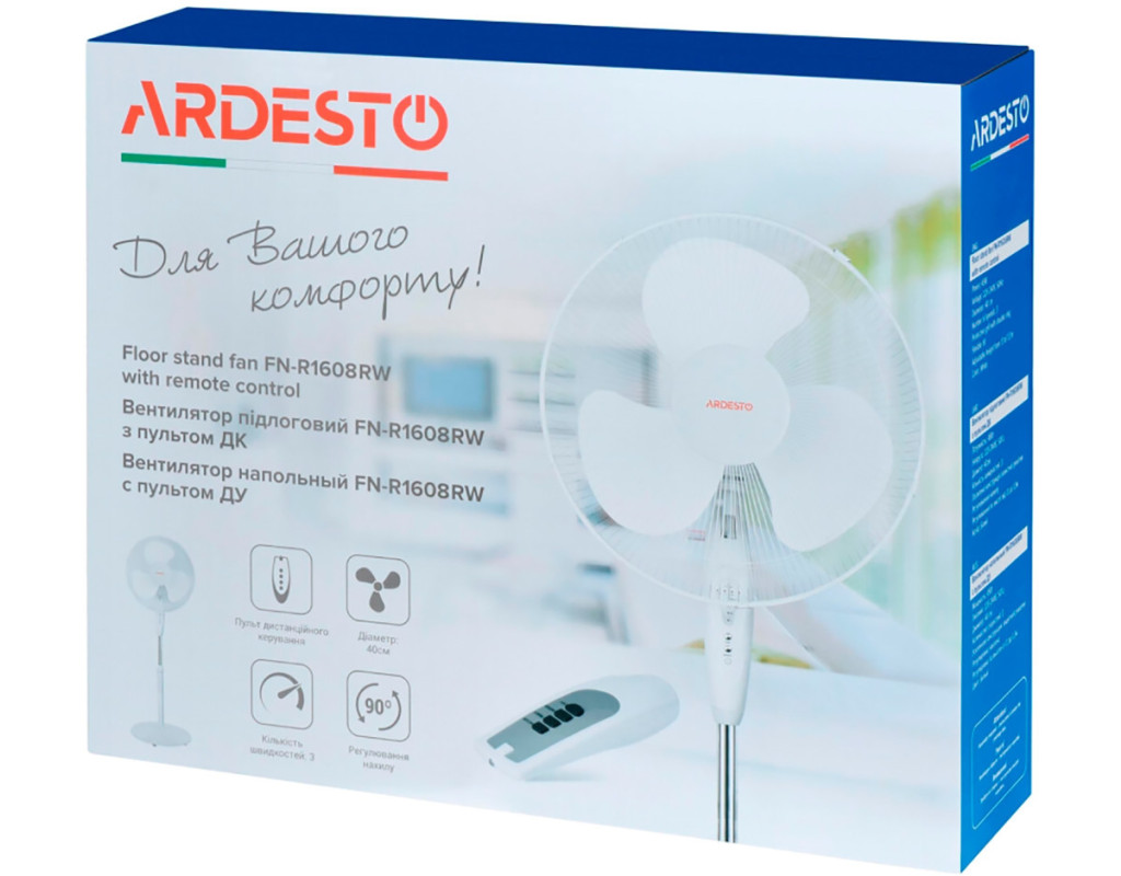 Вентилятор підлоговий Ardesto FN-R1608RW білого кольору з дистанційним управлінням і круглої опорою. Модель виконана з надійних, практичних і довговічних матеріалів. Потужний і функціональний Механічне управління реалізовано за допомогою двох клавіш, для дистанційного керування є пульт з чотирма кнопками. Потужність вентилятора - 45 Вт, є три швидкості, таймер і два режими роботи - постійний і періодичний. Обертання забезпечує рівномірний розподіл повітряних потоків в приміщенні. Надійна конструкція Діаметр лопатей досягає 40 см, а для безпеки використовується посилена конструкція захисної решітки. Надійну установку забезпечує хрестовина з розміром 52 см. У конструкції вентилятора передбачено регулювання нахилу в межах 90 градусів, а також регулювання по висоті - від 110 см до 125 см. |