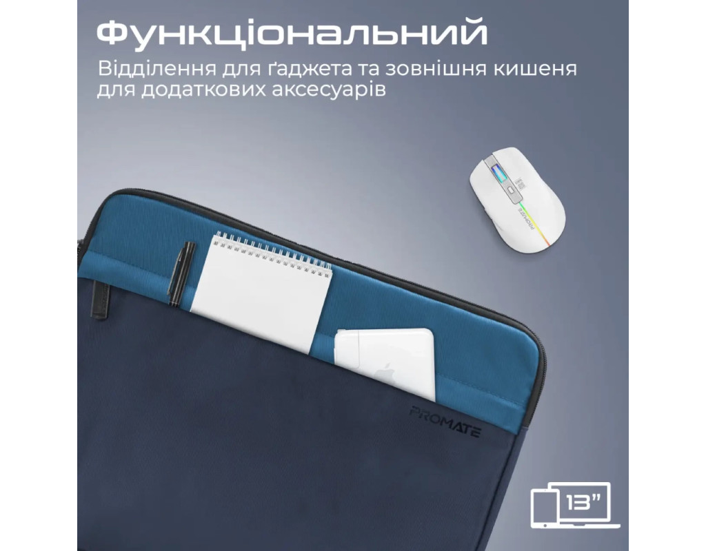 Limber-SB від Promate - легкий і міцний чохол із водовідштовхувальної тканини для 13" ноутбука або планшета. Захистить пристрій від пошкоджень та стильно доповнить будь-який образ. Особливості: