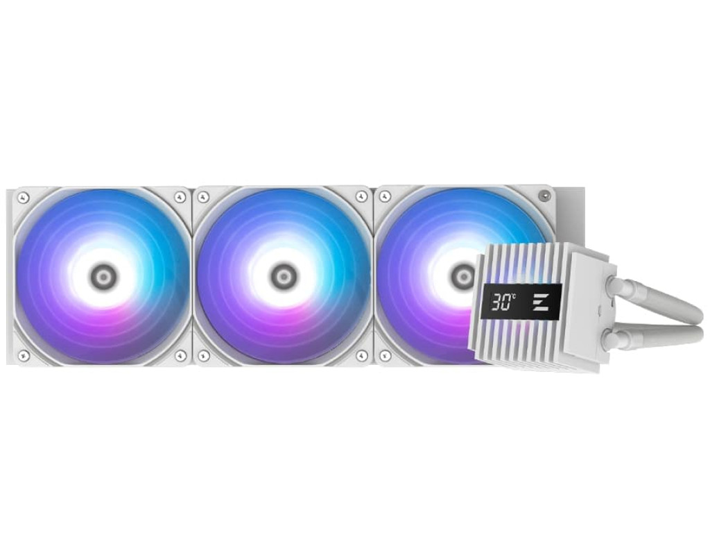 Zalman Alpha2 A36 — система рідинного охолодження, призначена для підтримки оптимальної температури процесора. Повністю сумісна з останніми процесорами Intel, а також AMD Ryzen, підтримує синхронізацію ARGB з різними материнськими платами. Alpha2 забезпечує потужне охолодження з низьким рівнем шуму. Оснащена інноваційною конструкцією помпи, яка запобігає перевантаженню шляхом розділення входу та виходу охолоджувальної рідини на два потоки. Крім того, магнітну головку помпи можна вільно обертати на 360˚ відповідно до напрямку трубки та розташування логотипа. Завдяки цьому ви зможете встановити радіатор у різних положеннях. Спеціально розроблений кільцевий вентилятор Zalman AF120 з лопатями у формі акулячого плавника забезпечує мінімальний опір повітряному потоку, що гарантуватиме мінімальний рівень шуму під час роботи. ШІМ контролює автоматичне регулювання швидкості трьох вентиляторів відповідно до рівня шуму навколишнього середовища для оптимальної продуктивності. Також є попередньо встановлені антивібраційні гумові накладки. Zalman Alpha2 A36 має характерний дизайн з адресним освітленням RGB, тому привертатиме увагу естетичними ефектами. Також наявний дисплей, який у реальному часі відображає температуру, дозволяючи контролювати стан системи. |