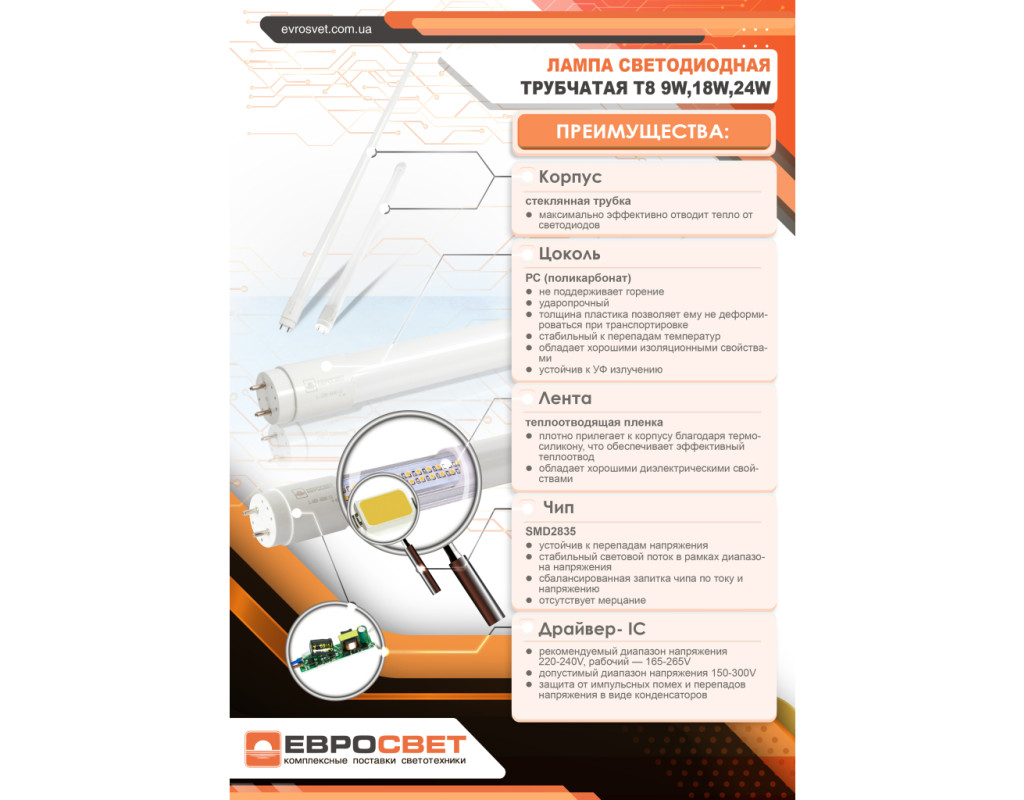 Лампа EVROLIGHT Т8 завдяки двосторонньому підключенню сумісна з більшістю світильників, доступних в Україні. А технічні параметри враховують умови використання і на промисловості, і вдома. Лампа захищена від імпульсних перешкод і перепадів напруги. Допустимий діапазон складає 165-300 В. Цоколь G13 пластиковий, він не підтримує горіння і забезпечує ізоляцію для захисту людей від ураження електрикою. Спектр 6400К стимулює мозок на продуктивну працю протягом багатьох годин, тому лампи з таким спектром обирають для приміщень, де люди проводять багато часу. |