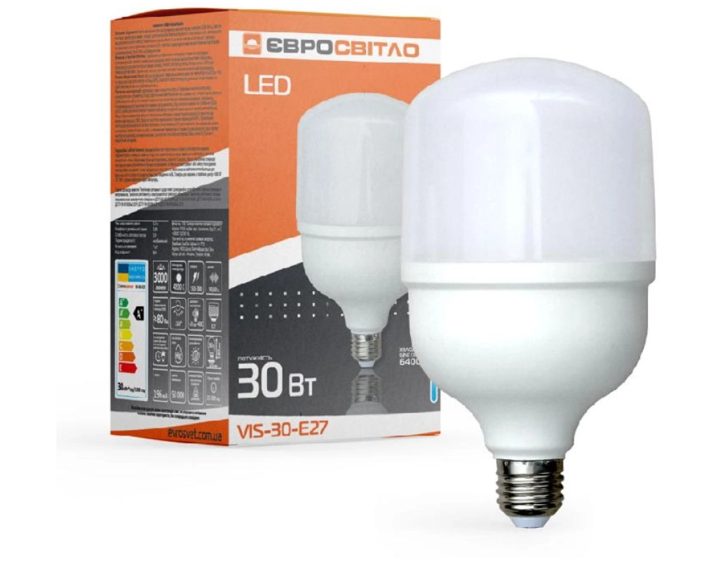 Лампу світлодіодну високопотужну Євросвітло 30Вт 4200К (VIS-30-E27) беруть для складів, заводів, промислових підприємств і вулиці. Вона дає рівномірне потужне світло і споживає в 10 разів менше електроенергії, ніж лампа розжарювання такої ж яскравості. Лампа світлодіодна високопотужна Євросвітло 30Вт 4200К (VIS-30-E27) підходить для місць, де важливо яскраве освітлення, що не спотворює колір. Особливості освітлювального приладу: