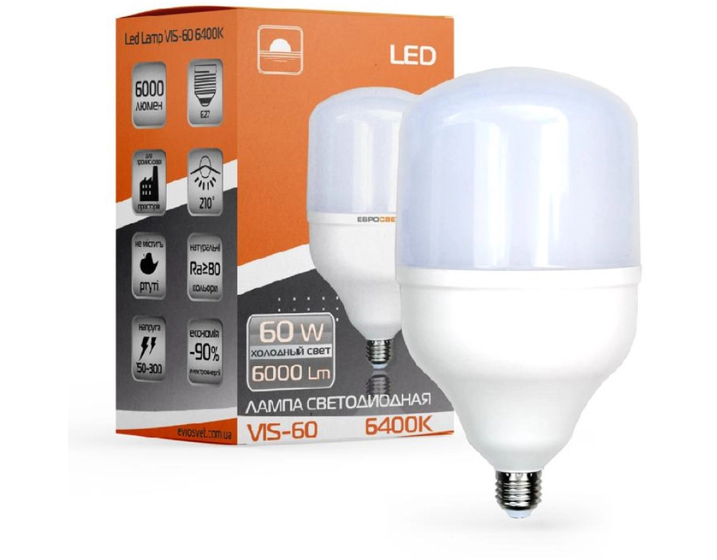Лампу світлодіодну високопотужну Євросвітло 60Вт 6400К (VIS-60-E40/E27) беруть для складів, заводів, промислових підприємств і вулиці. Вона дає рівномірне потужне світло і споживає в 10 разів менше електроенергії, ніж лампа розжарювання такої ж яскравості. Лампа світлодіодна високопотужна Євросвітло 60Вт 6400К (VIS-60-E40/E27) підходить для місць, де важливо яскраве освітлення, що не спотворює колір. Особливості освітлювального приладу:
