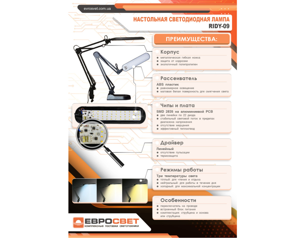Настільна світлодіодна лампа Євросвітло Ridy-09_SP 9Вт — це потужне та стильне рішення для організації комфортного освітлення робочого простору. Її ключова особливість — висока яскравість у поєднанні з подовженим плафоном, який забезпечує рівномірне освітлення більшої площі столу. Модель Ridy-09 створена з урахуванням потреб людей із неідеальним зором. Саме ті, хто носить окуляри або контактні лінзи, часто страждають від недостатньої яскравості — але тільки не з Ridy-09. Підвищена світловіддача забезпечується у всіх режимах освітлення. Лампа пропонує три режими кольорової температури: тепле світло (3000К) для відпочинку, нейтральне (4000К) — для щоденних справ, та холодне (6000К) — для максимальної концентрації. Перемикання режимів здійснюється кнопкою на шнурі. Гнучка конструкція дозволяє змінювати кут нахилу та висоту плафона, щоб спрямувати світло саме туди, де це необхідно. Це особливо зручно для читання, письма чи роботи за комп’ютером — світло не напружує зір і не створює тіней. Сучасний білий дизайн надає лампі витонченості та легко інтегрується в інтер’єр будь-якого стилю. Завдяки стійкій основі лампа надійно стоїть на столі, а компактна вилка не заважає іншим пристроям у розетці, адже блок живлення вбудований у корпус. Настільна лампа Євросвітло Ridy-09 9Вт — це поєднання функціональності, зручності та сучасного дизайну, яке стане надійним інструментом для щоденної роботи або навчання. |