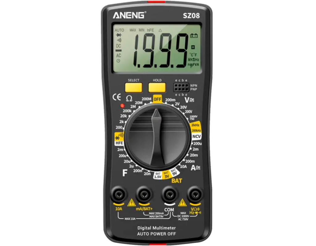 ємність (С), напруга (V), опір (R), прозвонка ланцюга, струм (А), температура (T), тестування діодів, частота (F) |