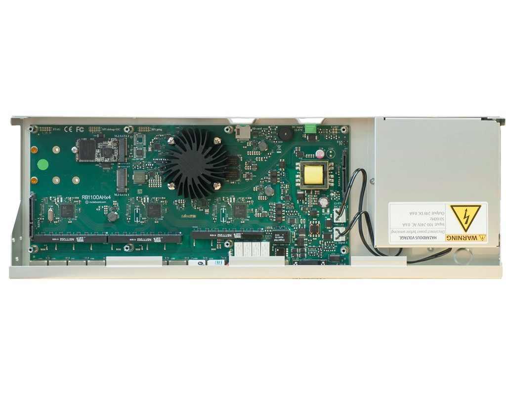| MikroTik RB1100AHx4 Dude Edition (модель RB1100Dx4) - це гігабітний роутер на 13 Ethernet портів. Його використовують в мережах з кількістю абонентів понад 100 осіб, а також для побудови швидкісних VPN каналів. В даному маршрутизаторі встановлено SSD диск на 60Гб, що дозволяє його повноцінно використовувати в якості сервера The Dude. Це дуже зручний інструмент системного адміністратора. The Dude сервер дозволяє скласти карту мережі, моніторити пристрою в ній і повідомляти про збої. Пропускна здатність всіх портів в повному дуплексі до 7,5 Гбіт / с. Роутер підтримує апаратне шифрування IPsec зі швидкістю 2.2 Гбіт / с з шифруванням AES128. Операційна система: RouterOS Level 6 license Ззаду корпусу RB1100AHx4 розташовані два роз’єми для подачі живлення 220В, роз’єм DC telecom для подачі живлення з постійною напругою 20-57В (підтримується 48В) і слот microSD. Два роз’єму 220В призначені для подачі резервного живлення на роутер в разі, якщо воно пропаде на одній з ліній. Роз’єм живлення DC telecom можна використовувати, наприклад, для підключення акумуляторної батареї. Роутер також можна живити за технологією PoE через мережевий порт Eth13. Підтримується напруга 20-57В і стандарти 802.3af / at і Passive PoE. |