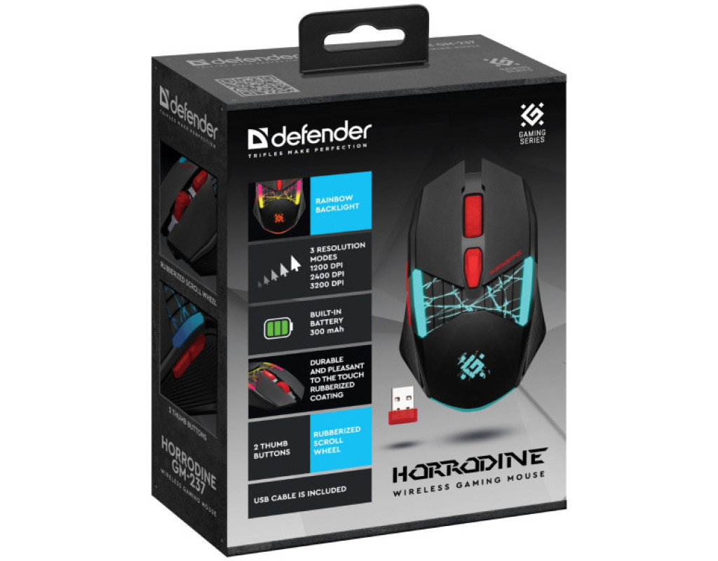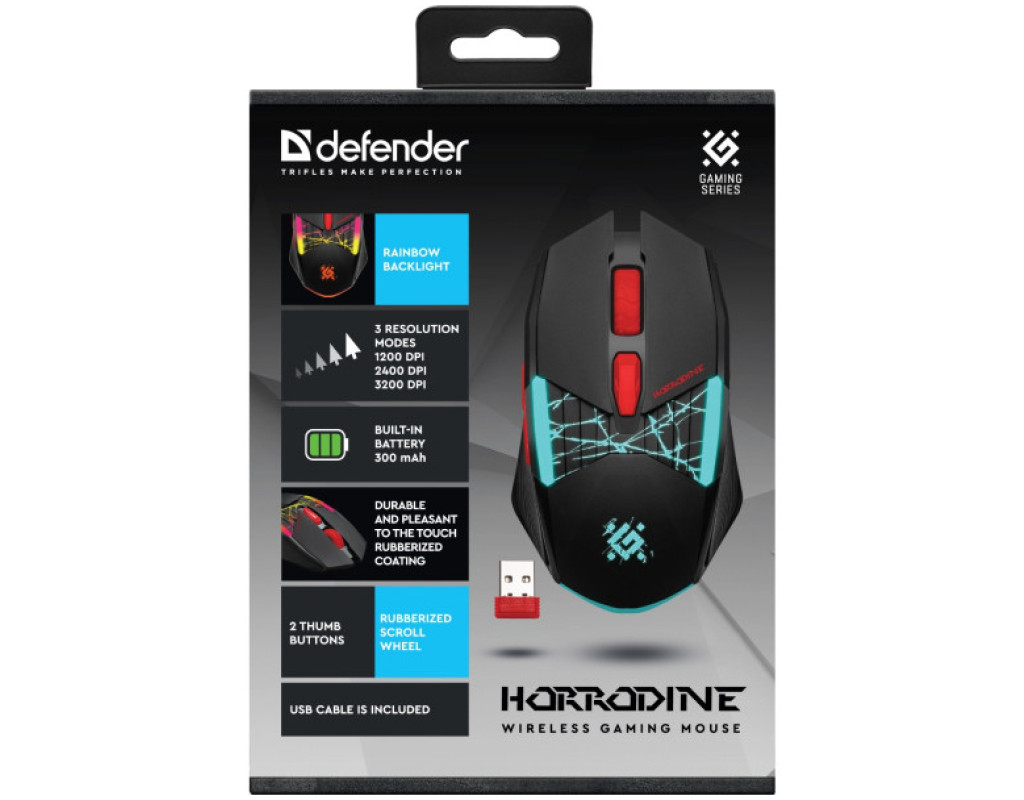 Бездротова ігрова миша Horrodine GM-237 Модель оснащена оптичним сенсором із трьома режимами роздільної здатності — 1200, 2400 і 3200 DPI. Перемикання DPI відбувається швидко та інтуїтивно, дозволяючи гравцю миттєво адаптуватися до ситуації в грі. Завдяки тефлоновим ніжкам миша плавно ковзає по будь-якій поверхні, забезпечуючи точний контроль без ривків та затримок. Широке прогумоване колесо прокрутки з підсвічуванням не тільки додає стильного вигляду, але й забезпечує зручну навігацію. Загалом миша має п’ять програмованих кнопок, включаючи дві бічні, що відкривають можливості для персоналізації під будь-яку гру або робочий процес. Веселкове підсвічування додає динамічності візуальному оформленню, а за потреби його можна вимкнути або активувати енергозберігаючий режим ECO. Акумулятор ємністю 300 мА*год забезпечує до 70 годин автономної роботи, а зарядка відбувається через зручний роз’єм Type-C. Кабель для заряджання входить у комплект. Підтримка програмного забезпечення Defender Game Center дозволяє створювати макроси, змінювати функції кнопок і навіть емулювати клавіші клавіатури. Миша працює на частоті 2.4 ГГц із надійним бездротовим з'єднанням у радіусі до 10 метрів. Це — чудовий вибір для тих, хто шукає баланс між функціональністю, стилем і зручністю. Комплектація: