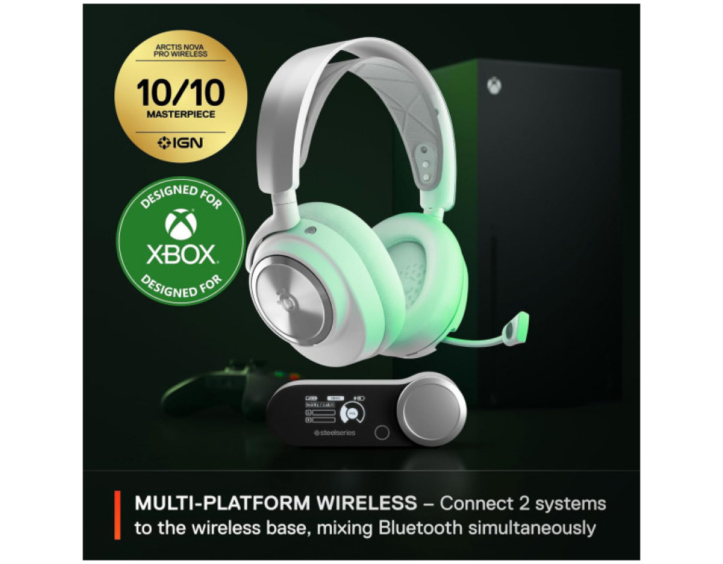 Steelseries Arctis Nova Pro X Wireless — комбінована накладна гарнітура для Xbox, яка подарує грі неймовірний та захопливий звук. Неперевершена чіткість і якість звуку поєднуються в акустичній системі Nova Pro та преміальних драйверів High Fidelity, покращених за допомогою програмного забезпечення Sonar. Під'єднуйтеся за допомогою бездротових 2.4 ГГц і Bluetooth, або ж 3.5 мм (mini-Jack) чи USB Type-C. Частотний діапазон для бездротового підключення становить 10 – 22 000 Гц, для дротового — 10 – 40 000 Гц. Головні особливості: - сертифікований Hi-Res GameDAC Gen 2 підвищує якість аудіо, підвищуючи роздільну здатність для 78% чистішого звуку з меншими спотвореннями для якості, нечуваної в інших ігрових гарнітурах; |