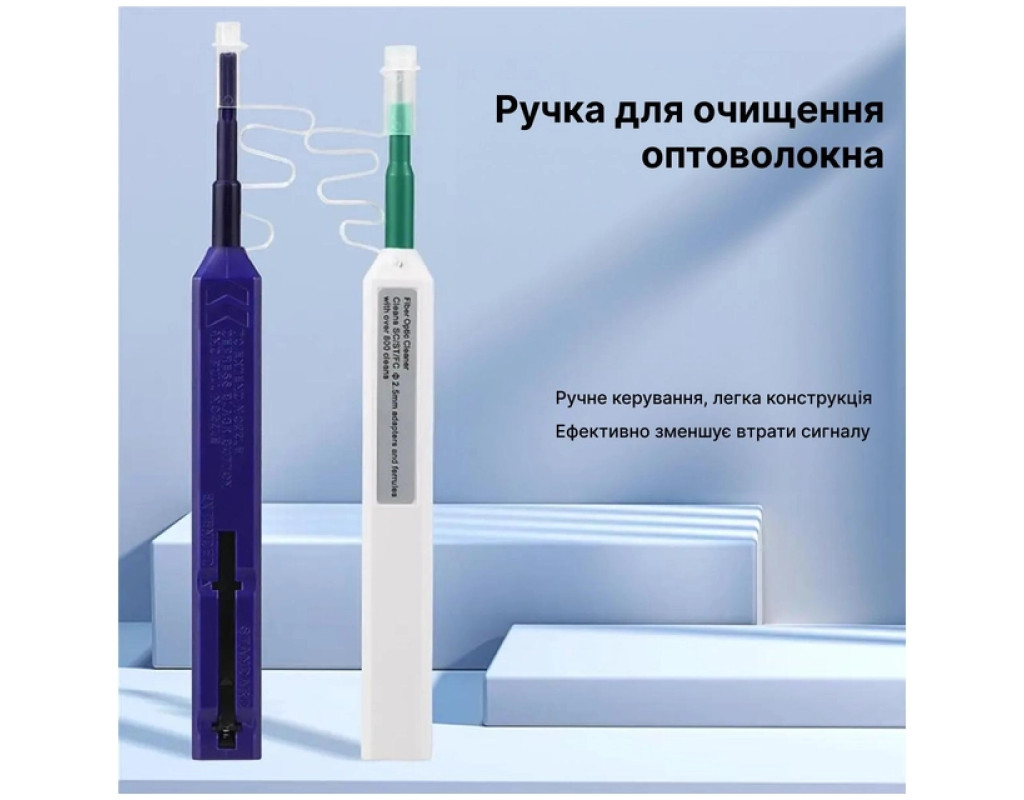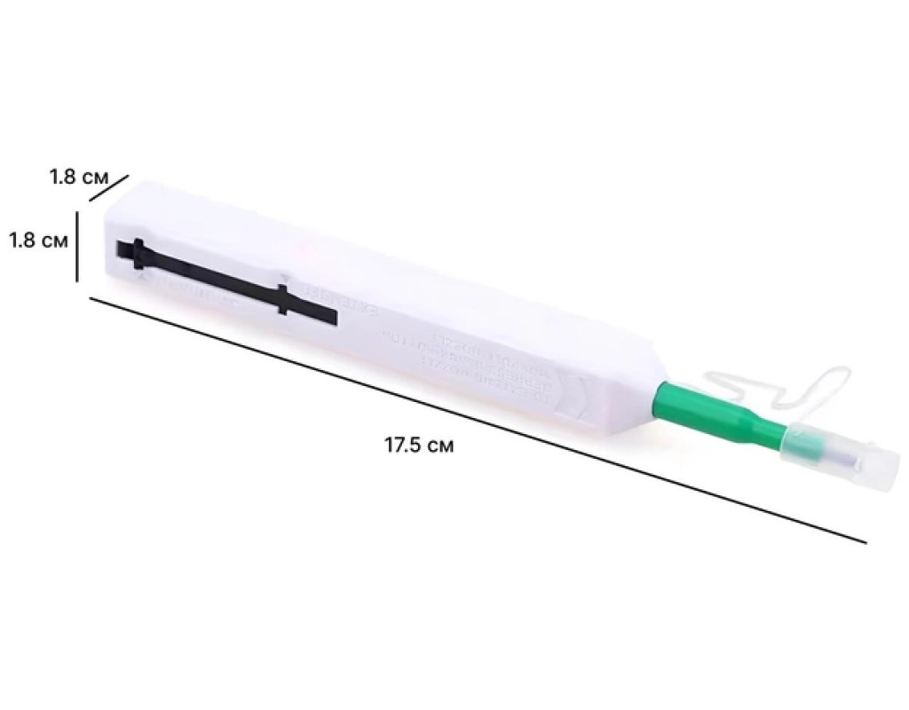 Інструмент для очищення конекторів One-Click-2.5 дозволяє очищувати торець ферули оптичного конектора від забруднення. Він підходить для конекторів з ферулою діаметром 2,5 мм, тобто таких як FC, SC, ST та інших. Інструмент дозволяє проводити очищення не тільки безпосередньо конектора, а й конектора встановленого в адаптер, наприклад в разі установки в кросі, в 19-дюймову патч-панель. Очищення конектора відбувається за рахунок безворсової очищувальної нитки на кінчику інструменту. При введенні інструменту в конектор і натисканні, очищувальний кінчик з ниткою провертається, забезпечуючи акуратне і ефективне очищення. Сам очищувач дуже зручний і компактний, без проблем може поміститися в кишені, а його ресурсу вистачить на 500 очисток. Основні особливості: