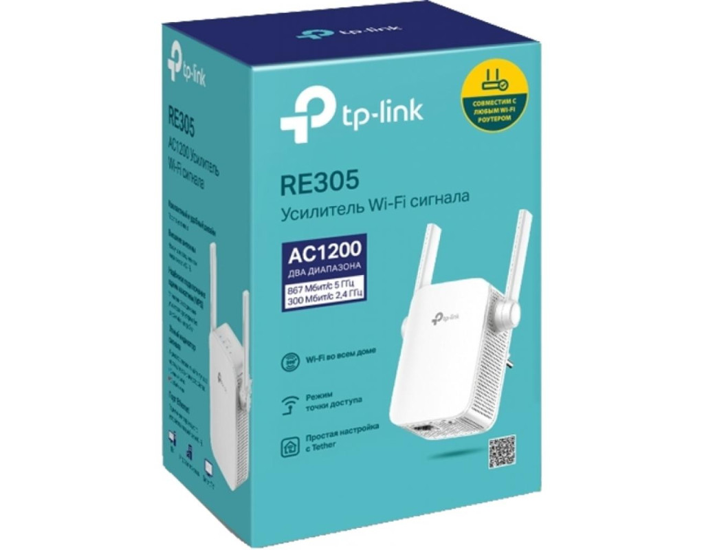 Ретранслятор TP-LINK AC1200 RE305 призначений для розширення Wi-Fi у двох діапазонах і усунення мертвих зон. Легке розширення Wi-Fi мережі Ви втомилися від мертвих зон Wi-Fi в себе вдома? Ретранслятор RE305 під'єднається до Wi-Fi роутера через бездротову мережу та підсилить покриття там, де роутер не справляється, знижуючи інтерференцію сигналу та забезпечуючи надійне покриття Wi-Fi у всьому будинку або офісі. Швидкий дводіапазонний Wi-Fi для надійних з'єднань RE305 дасть змогу під'єднати більше пристроїв одночасно на 2.4 ГГц (швидкість до 300 Мбіт/с) і на 5 ГГц (швидкість до 867 Мбіт/с). Використовуйте 2.4 ГГц для відправлення e-mail і роботи в інтернеті, а 5 ГГц — для онлайн-ігор і перегляду HD-відео. Зручне встановлення Розумний індикатор дасть змогу вам знаходити найпридатніше місце для розміщення RE305. Режим точки доступу RE305 — це більше ніж підсилювач Wi-Fi сигналу. Під'єднайте до нього кабель Ethernet і перетворіть дротовий інтернет на бездротову мережу. Віддалене керування RE305 працює з усіма Wi-Fi роутерами. Використовуйте мобільний застосунок Tether для швидкого налаштування пристрою зі смартфона на Android і iOS. Це багатофункціональний застосунок дасть змогу вам не тільки швидко налаштувати підсилювач Wi-Fi сигналу, але й легко керувати мережею зі смартфона. Особливості: