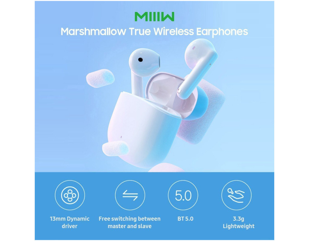 Компактна форма MiiiW Marshmallow MWTW03 – компактні бездротові навушники із зарядним кейсом. Кейс навушників виконаний із матового пластику, у той час як самі навушники глянсові. Дизайн простий та лаконічний. Вага кожного навушника 3.3 г. Форма навушника забезпечує комфортну посадку у вусі.