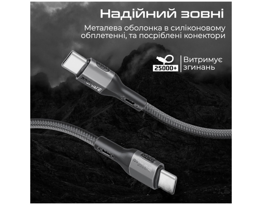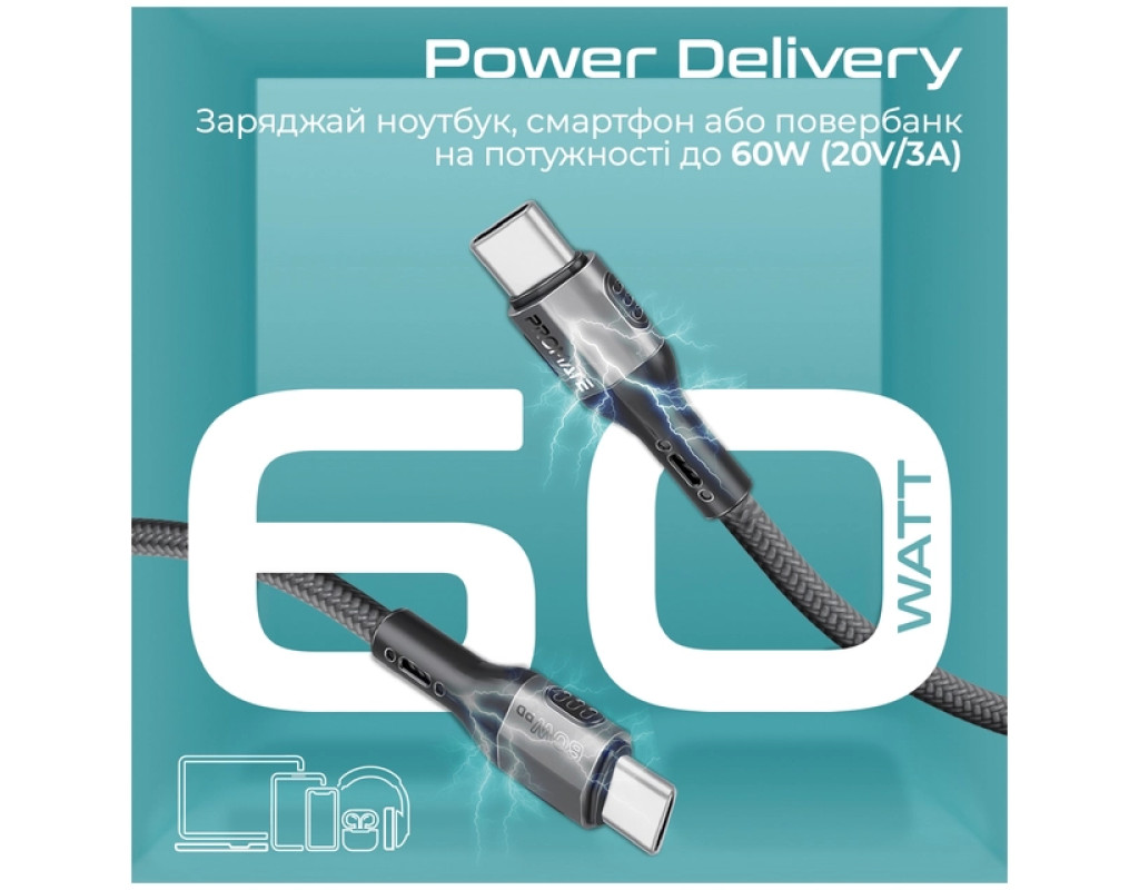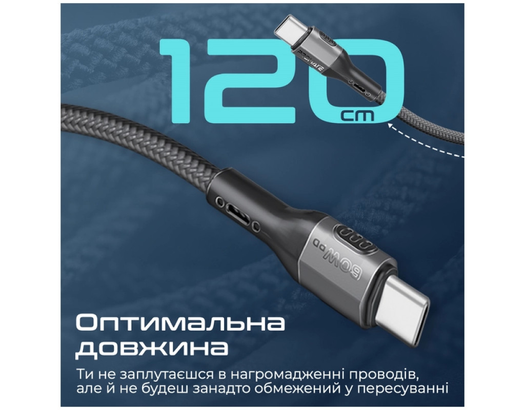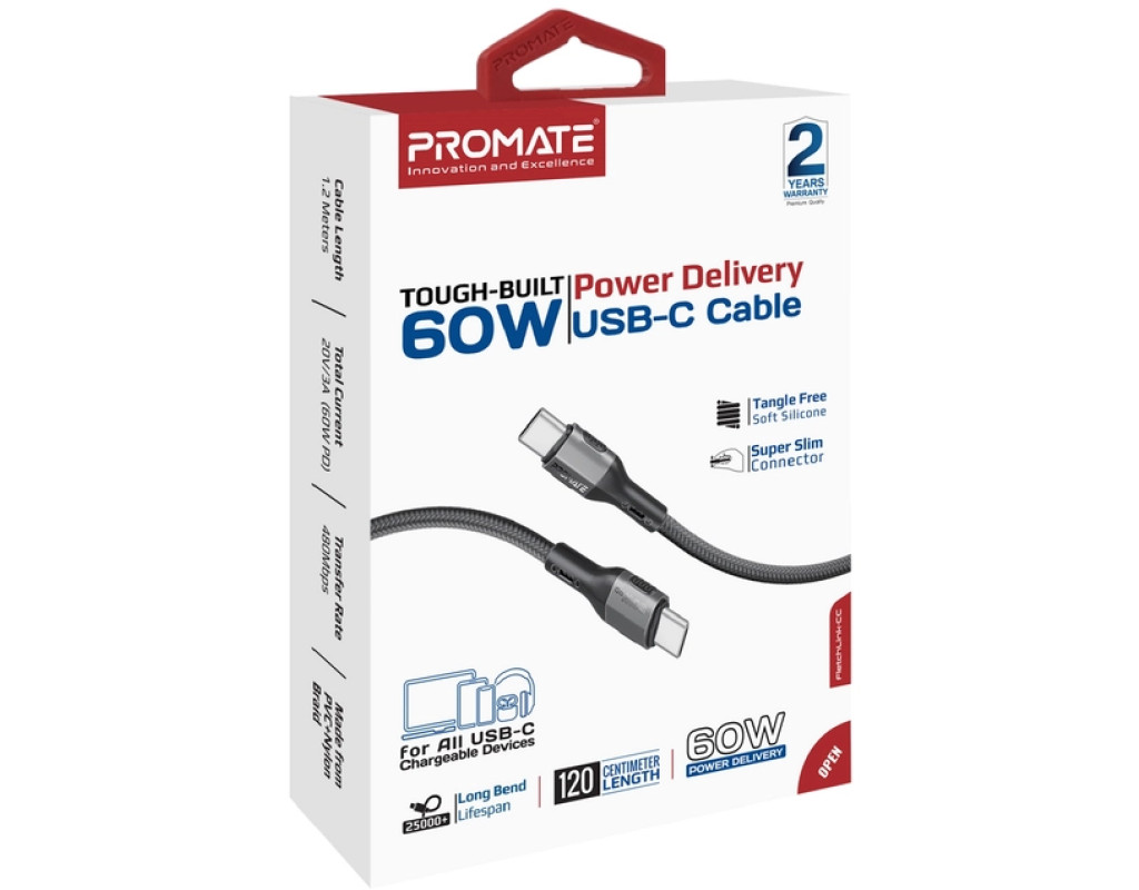 Дата кабель USB-C to USB-C 1.2m 60W PD FletchLink-CC black Promate (fletchlink-cc.black)