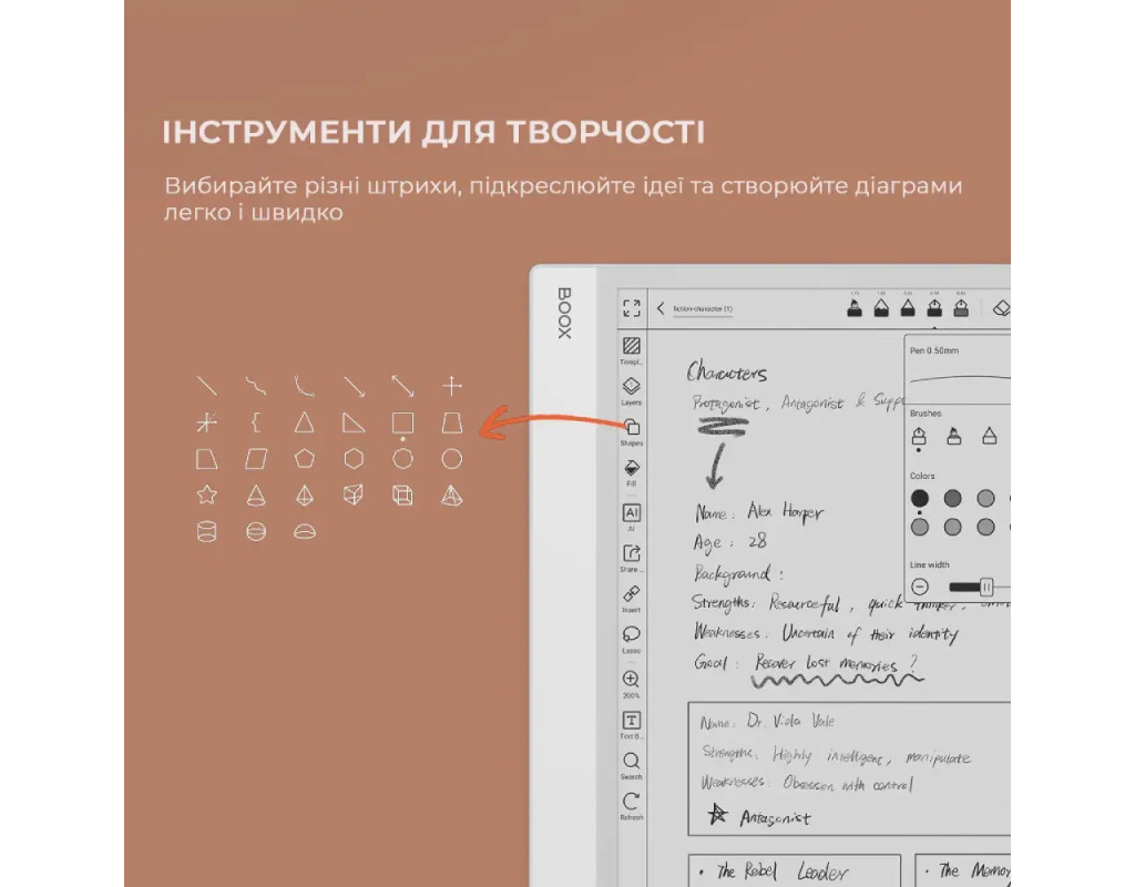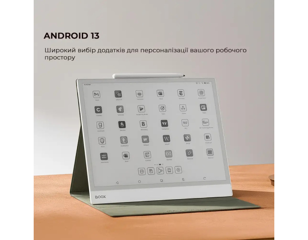 Великий робочий простір і неперевершена чіткість Чорно-білий дисплей ePaper товщиною 4,6 мм, 13,3 дюйма. Універсальне рішення для перегляду вмісту Легко виділіть, додайте примітки, синхронізуйте та налаштуйте свій досвід читання в будь-якому форматі. Рідер, який іде в ногу з вашими ідеями Легко створюйте, редагуйте та впорядковуйте свої думки за допомогою письма, схожого на папір. Ефективно виконуйте свою творчу та професійну роботу Восьмиядерний процесор 2,8 ГГц з 6 ГБ оперативної пам’яті. Легка навігація та доступ Користуйтеся швидким доступом за допомогою віджетів, що налаштовуються, і насолоджуйтеся швидкою синхронізацією нотаток, а також обмінюйтеся файлами без зайвих зусиль. Широке полотно, елегантна тонкість Ультратонкий Note Max оснащений 13,3-дюймовим екраном HD E Ink Carta 1300, що забезпечує достатньо місця для розвитку думок без зайвих зусиль. Погляньте ближче Note Max - це ретельно продуманий дизайн, що поєднує в собі спокійний і витончений дизайн, доповнений позачасовою елегантністю класичної лінійки Note на задній панелі. Його чистий, стриманий вигляд покращує ваш робочий простір, а дисплей, схожий на папір, втілює простоту та чистоту. Неперевершена чіткість для ваших найяскравіших ідей Завдяки приголомшливій роздільній здатності 300 PPI кожне слово оживає, запрошуючи вас зануритися в текст, одночасно посилюючи вашу увагу. Переглядайте документи без зайвих зусиль Виділяйте, коментуйте та пов’язуйте файли, щоб легко впорядкувати свої думки. Завдяки функції розділеного екрану ви можете порівнювати документи та робити нотатки одночасно. Динамічні можливості для створення нотаток Ультратонкий Note Max оснащений 13,3-дюймовим екраном HD E Ink Carta 1300, що забезпечує достатньо місця для розвитку думок без зайвих зусиль. Швидкий доступ до суміжних матеріалів Використовуйте інструмент вставки, щоб зібрати всю інформацію в одному місці. Додавайте посилання на нотатки, файли або веб-сайти для легкого пошуку. Створюйте конспекти для легкої навігації Легко створюйте впорядковані конспекти для своїх нотаток, забезпечуючи швидкий доступ до певних розділів. Заощаджуйте цінний час під час лекцій та письмових робіт, роблячи свій робочий процес ефективнішим і продуктивнішим. Покращена інтеграція з гіперпосиланнями в нотатках PDF Безперешкодно взаємодійте з гіперпосиланнями в шаблонах нотаток у форматі PDF, забезпечуючи легку навігацію в документах одним клацанням миші. Творіть з точністю за допомогою спеціальних інструментів Вибирайте різні штрихи пера, щоб чітко висловлювати свої ідеї, підкреслюючи ключові моменти або створюючи ілюстрації. За допомогою розширеного інструмента фігур ви можете легко створювати діаграми та графіки, коригуючи візуальні ефекти без особливих зусиль. Робочий процес без затримок, чудовий відгук Насолоджуйтеся безперебійною багатозадачністю та плавною роботою завдяки вдосконаленому восьмиядерному процесору з тактовою частотою до 2,8 ГГц. З 6 ГБ оперативної пам’яті та технологією BOOX Super Refresh ви відчуєте плавну та швидку роботу. Картування ідей у реальному часі Проводьте мозкові штурми та замальовуйте ідеї на місці, розширюючи можливості для творчості без жодних затримок. Безперебійна робота з додатками З Android 13 ви можете використовувати різноманітні додатки, щоб створити персоналізований центр для своїх проектів. С