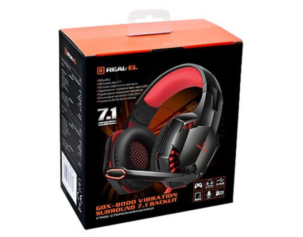 | Ігрові стереонаушники з мікрофоном REAL-EL GDX-8000 Vibration Surround 7.1 Backlit забезпечують відтворення реалістичного та об'ємного звуку 7.1, що дозволяє відчути всю міць спецефектів і повного ефекту присутності в грі.