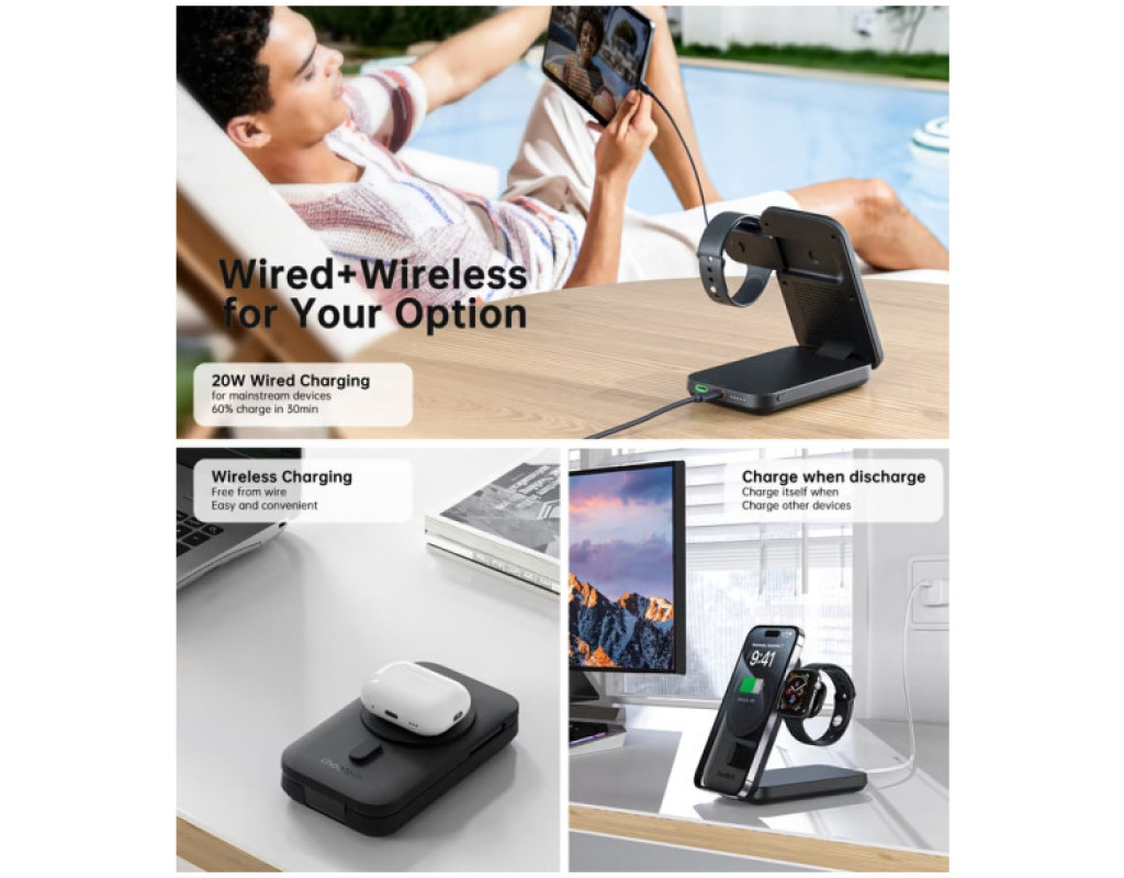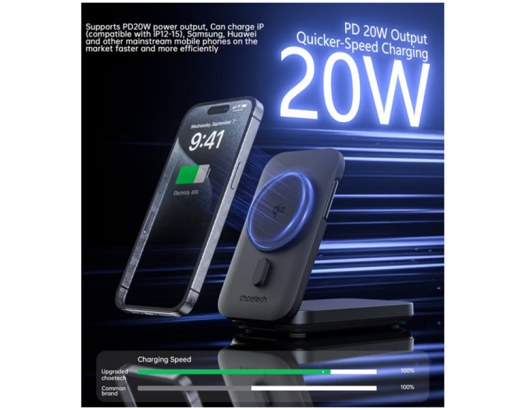 Універсальна мобільна батарея Choetech Magnetic Wireless 10000mAh 20W PD допоможе швидко та безпечно поповнити заряд пристроїв, сумісних зі стандартом Qi, а також USB Type-C та Lightning пристроїв. УМБ оснащена портами USB-С та Lightning з вихідною потужністю до 20 Вт. Максимальна зарядна потужність бездротового заряджання для Apple Watch становить 2.5 Вт, для інших Qi пристроїв - 15 Вт. Вбудоване магнітне кільце забезпечує автоматичне і точне підключення мобільних пристроїв та їхню надійну фіксацію в горизонтальному або вертикальному положенні. Оптимізована конструкція зарядного пристрою дає можливість використовувати його як магнітну підставку під час роботи. Коли пристрій не використовується, його можна компактно скласти. Світлодіодна індикація сповіщатиме про поточний рівень її заряду. УМБ Choetech Magnetic Wireless 10000mAh 20W PD підтримує зарядну потужність до 20 Вт та більшість протоколів швидкого заряджання, у тому числі – QC3.0, PD3.0, AFC, FCP та Apple2.4A. Заряджайте одночасно декілька пристроїв. Вбудований захист від перезаряду, надмірного струму, перенапруги та короткого замикання робить батарею Choetech Magnetic Wireless 10000mAh 20W PD безпечною для користувачів та підключених пристроїв. |