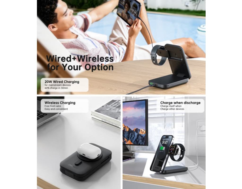 | Бездротовий зарядний пристрій Choetech Qi2 3in1 Magnetic Charger Holder – це інноваційне рішення для одночасної зарядки кількох пристроїв. Завдяки вбудованому акумулятору ємністю 10 000 мАг, він дозволяє заряджати до трьох пристроїв одночасно без використання дротів. Смартфон можна заряджати з потужністю до 15 Вт, а Apple Watch, Samsung Watch або AirPods отримують стабільну потужність по 3 Вт. Усі пристрої зручно розміщуються на спеціальній підставці, забезпечуючи акуратну та безпечну зарядку |