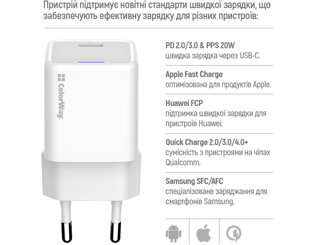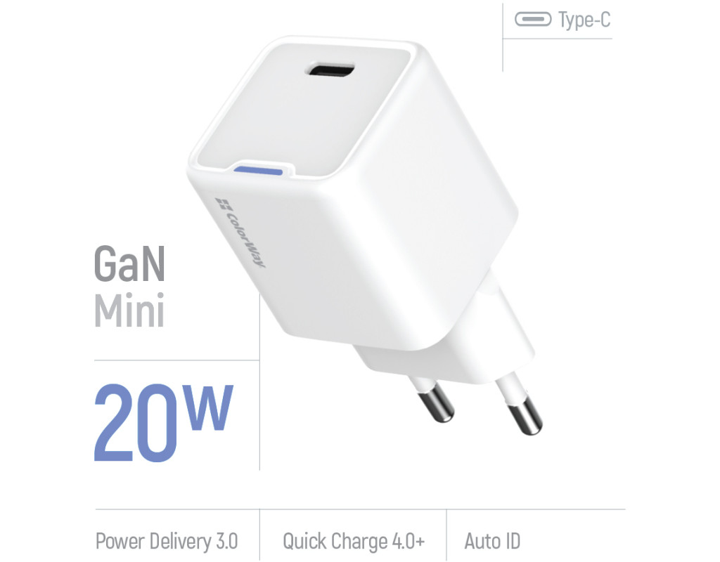 | Мережевий зарядний пристрій Colorway GaN Mini 20W PD Port PPS USB-C використовує технологію нітрид галію (GaN) замість традиційних кремнієвих транзисторів, що робить його більш ефективним і компактом. Завдяки цьому адаптер майже не нагрівається, споживає менше енергії та забезпечує швидку зарядку ваших гаджетів. Зарядний пристрій підтримує потужність до 20 Вт через порт USB-C Power Delivery 3.0, ідеально підходить для швидкої зарядки таких смартфонів як iPhone 16, 15, 14, 13, 12, 11, iPhone SE, iPad Pro, а також багатьох інших гаджетів. Наприклад, iPhone 12 Pro можна зарядити до 50% лише за 30 хвилин.Інтелектуальна мікросхема адаптеру автоматично підбирає оптимальні параметри зарядки до 3А для забезпечення максимальної ефективності. Адаптер сумісний з більшістю сучасних смартфонів, планшетів і інших електронних пристроїв, підтримує кілька технологій швидкої зарядки, таких як PD 3.0, Huawei FCP, Quick Charge і Samsung AFC. Додатково адаптер оснащений системою багаторівневого захисту: від короткого замикання, перегріву, перенапруги й перевантажень по струму. Корпус, виготовлений із вогнестійкого ABS-пластику, відрізняється стійкістю до подряпин та ударів, забезпечуючи надійність і тривалий термін служби навіть за інтенсивного використання. Завдяки компактним розмірам, пристрій зручно носити з собою в сумці чи кишені. Colorway GaN Mini — це ідеальний вибір для швидкої, ефективної та безпечної зарядки вдома чи в подорожах.