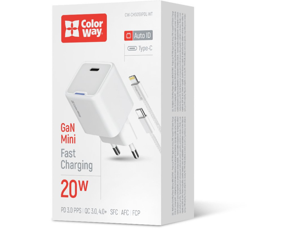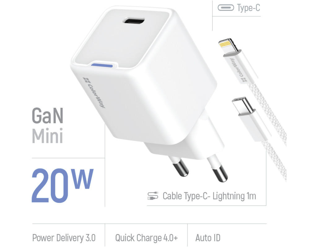 | Мережевий зарядний пристрій Colorway GaN Mini 20W PD Port PPS USB-C використовує технологію нітрид галію (GaN) замість традиційних кремнієвих транзисторів, що робить його більш ефективним і компактом. Завдяки цьому адаптер майже не нагрівається, споживає менше енергії та забезпечує швидку зарядку ваших гаджетів. Зарядний пристрій підтримує потужність до 20 Вт через порт USB-C Power Delivery 3.0, ідеально підходить для швидкої зарядки таких смартфонів як iPhone 16, 15, 14, 13, 12, 11, iPhone SE, iPad Pro, а також багатьох інших гаджетів. Наприклад, iPhone 12 Pro можна зарядити до 50% лише за 30 хвилин.Інтелектуальна мікросхема адаптеру автоматично підбирає оптимальні параметри зарядки до 3А для забезпечення максимальної ефективності. Адаптер сумісний з більшістю сучасних смартфонів, планшетів і інших електронних пристроїв, підтримує кілька технологій швидкої зарядки, таких як PD 3.0, Huawei FCP, Quick Charge і Samsung AFC. Додатково адаптер оснащений системою багаторівневого захисту: від короткого замикання, перегріву, перенапруги й перевантажень по струму. Корпус, виготовлений із вогнестійкого ABS-пластику, відрізняється стійкістю до подряпин та ударів, забезпечуючи надійність і тривалий термін служби навіть за інтенсивного використання. Завдяки компактним розмірам, пристрій зручно носити з собою в сумці чи кишені. Colorway GaN Mini — це ідеальний вибір для швидкої, ефективної та безпечної зарядки вдома чи в подорожах.