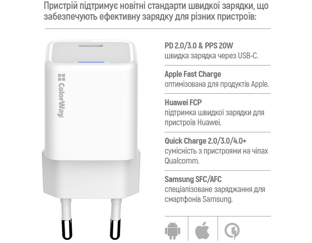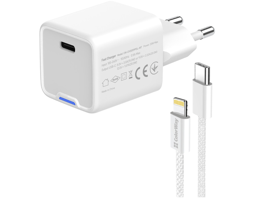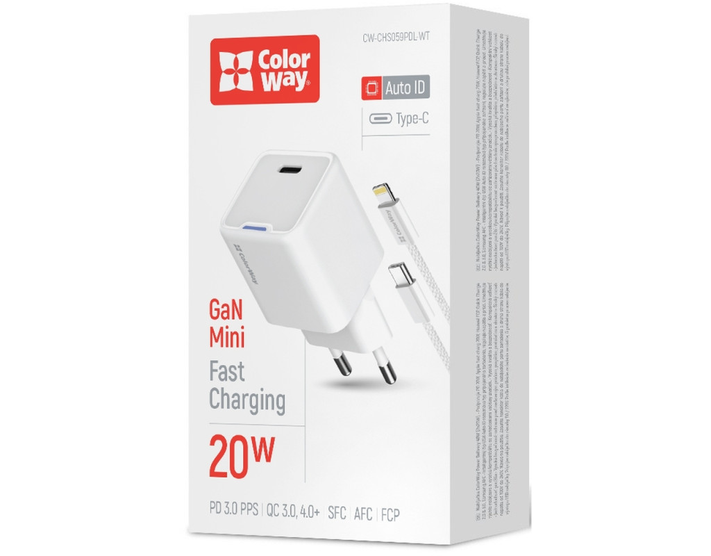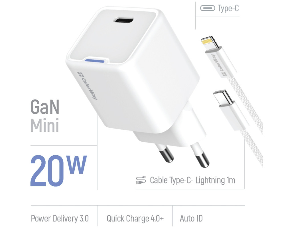 | Зарядний пристрій ColorWay C101D GaN Mini 20W PD PPS USB-C + cable USB-C to Lightning white (CW-CHS059PDL-WT) — це технологічний шедевр для сучасних користувачів, які цінують якість і швидкість. Високотехнологічна складова — нітрид галію (GaN), надає цьому адаптеру перевагу в ефективності та довговічності. Завдяки меншим тепловим втратах, GaN-транзистори роблять пристрій не тільки потужним, але й надзвичайно компактним, що дозволяє легко взяти його з собою в дорогу. Потужність до 20 Вт і вихідний струм 3 А у поєднанні з підтримкою Power Delivery 3.0 гарантують блискавичну зарядку будь-яких пристроїв — від смартфонів та планшетів до ноутбуків. Адаптер підтримує найсучасніші технології швидкої зарядки, включно з Quick Charge 4.0, Fast Charging та Programmable PowerSupply (PPS), що значно скорочує час зарядки. Ваш iPhone, наприклад, може зарядитися до 50% всього за 30 хвилин. Інтелектуальна мікросхема автоматично підбирає оптимальні параметри, забезпечуючи захист від перегріву, перенапруги і короткого замикання. Корпус з вогнестійкого ABS-пластику виготовлено для тривалого використання. В комплект входить кабель USB-C to Lightning, який забезпечує високу швидкість зарядки для продукції Apple. Цей зарядний пристрій ідеально підходить для подорожей та домашнього використання. Обираючи ColorWay GaN Mini 20W, ви обираєте безкомпромісну швидкість, ефективність і безпеку. |