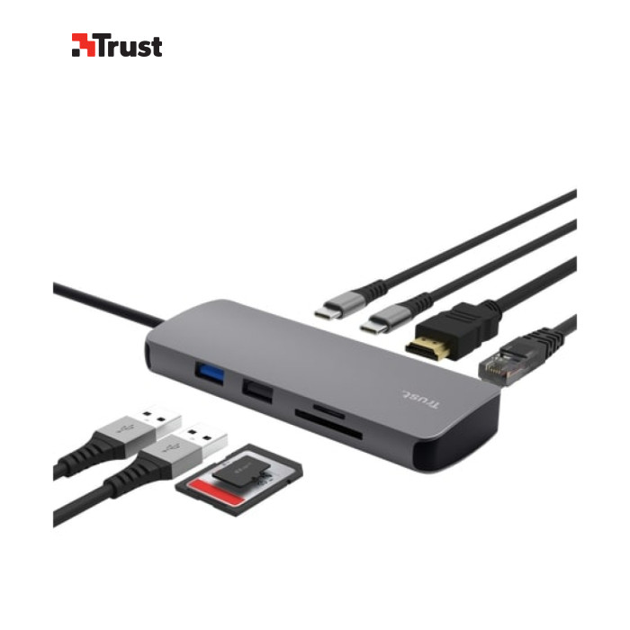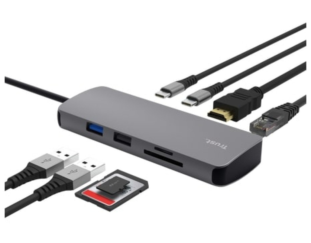 | Стильний алюмінієвий Trust Dalyx 8‑в‑1 USB‑C хаб розширює лише один порт ноутбука: додає HDMI, RJ‑45 Ethernet, кард‑рідери (SD та micro‑SD), 1× USB‑A 3.2, 1× USB‑A 2.0 та 2× USB‑C (дата + PD). Компактний (кабель 15 см, вага ≈ 68 г), міцний і сумісний із багатьма ОС—ідеальний для мобільного робочого простору |