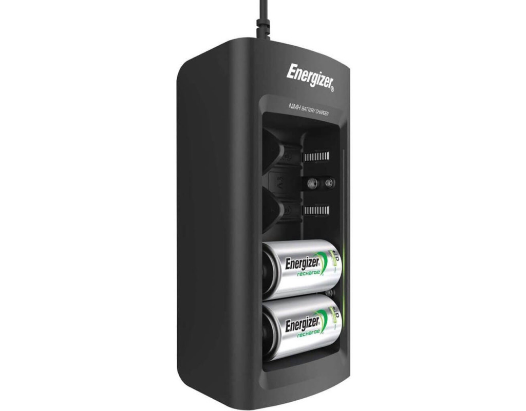 | Зарядний пристрій Energizer Recharge Universal Charger у блістері, LED індикатор, чотири слоти, двоканальна. Заряджає по 2 однакові акумулятори або "крони" незалежно.