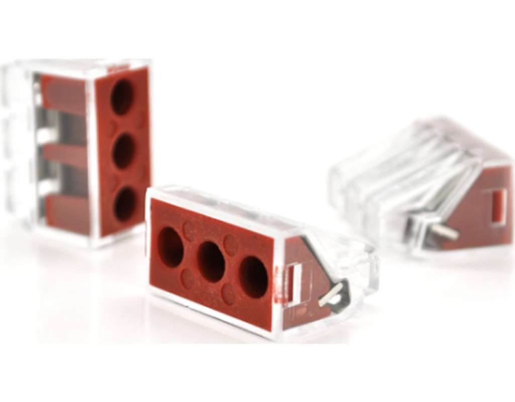 WAGO K773‑173 — трьохконтактна push‑in клема для швидкого та надійного з’єднання проводів 2,5–6 мм² у розподільних коробках, прозорий корпус з червоними важелями. |
