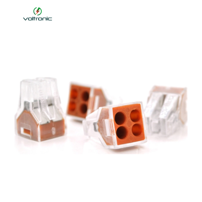WAGO 773-104 — 4-контактний Push-Wire® з’єднувач для проводів до 2,5 мм², 24 А, 400 В, прозорий корпус. |