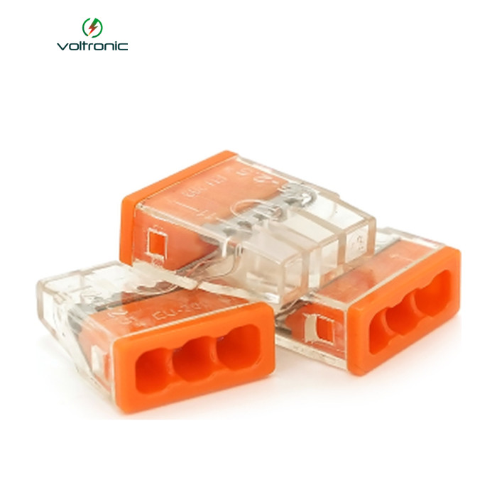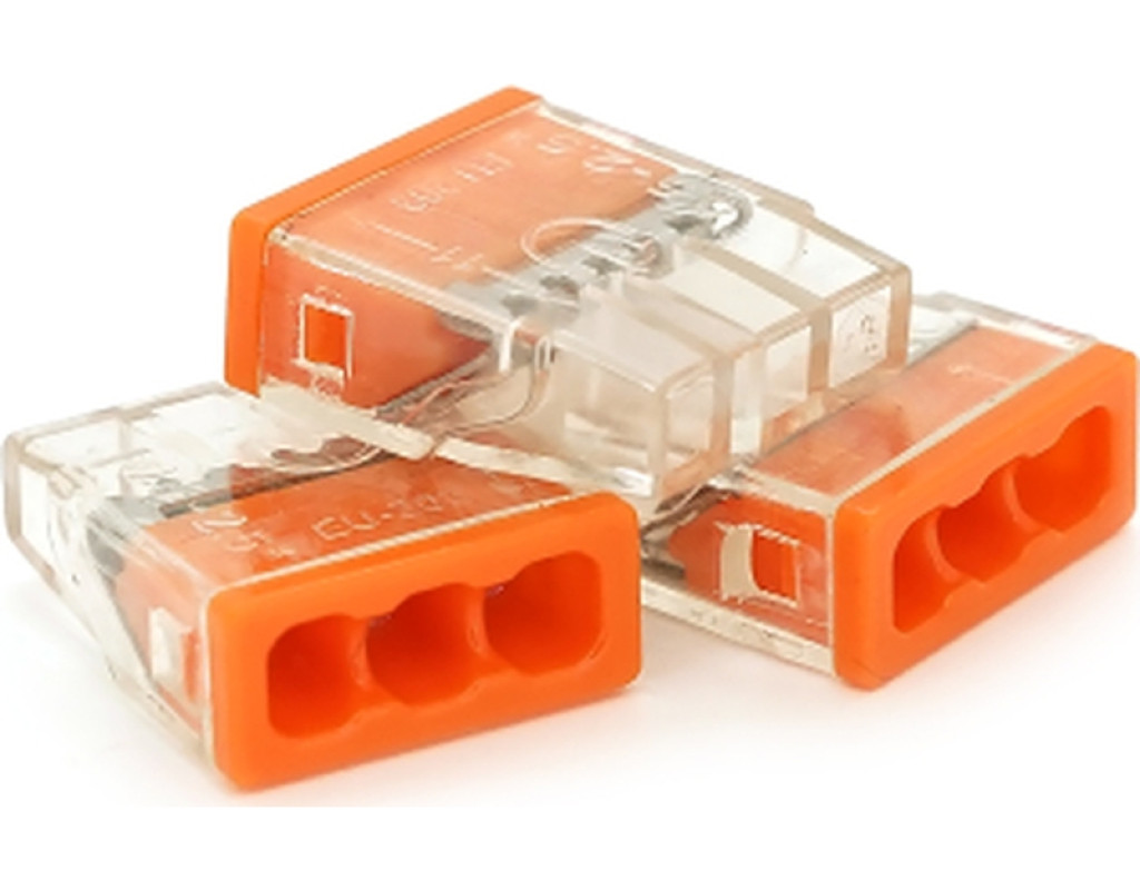 WAGO K773‑203 — триконтактна push‑in клема для швидкого та надійного з’єднання проводів у розподільних коробках, прозорий корпус. |