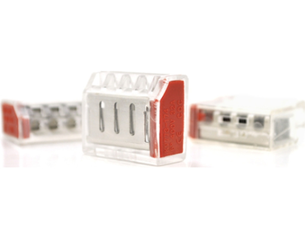 WAGO K773-173 — триконтактна push-in (натискна) клема, ідеальна для швидкого монтажу проводів у розподільних коробках. Прозорий корпус з червоними важелями гарантує візуальний контроль та зручність використання. |