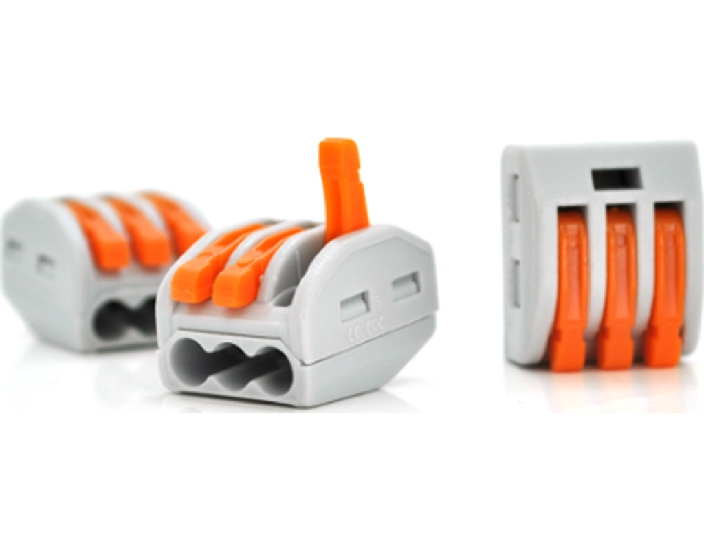 WAGO K222‑413 — трьохконтактний push‑in з’єднувач (Lever‑Nuts®) для швидкого та надійного монтажу проводів у розподільних коробках, прозоро-сірий корпус. |