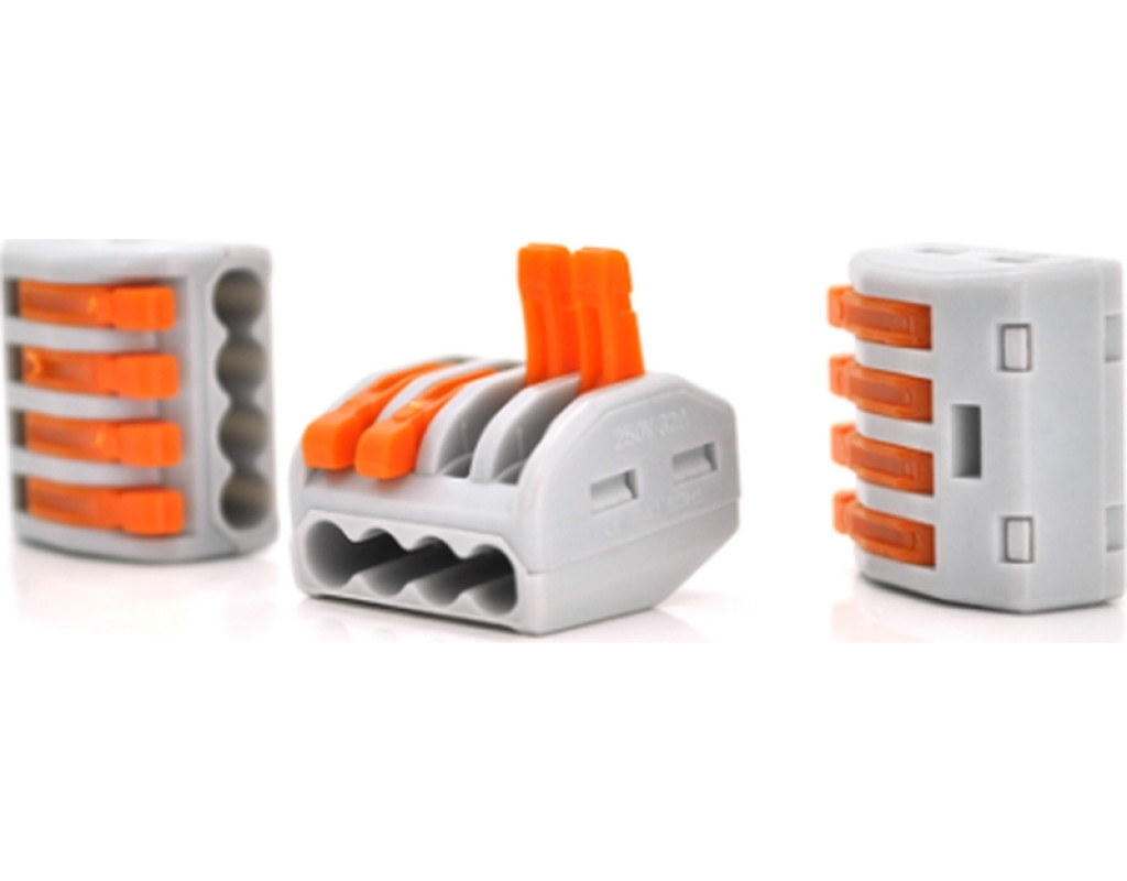 WAGO 222-414 — універсальний 4-контактний важільний з’єднувач для швидкого та надійного з’єднання мідних однодротяних, багатодротяних та гнучких проводів перетином 0,08–4 мм². Забезпечує струм до 20 А та напругу до 600 В. Має компактний корпус, зручний механізм важільного фіксування та можливість багаторазового використання. |