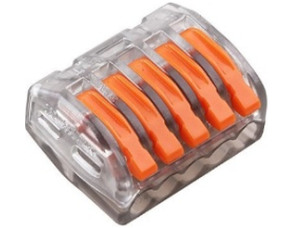 WAGO PCT-415-T — компактна 5-контактна клема з важільцями для з’єднання мідних багатожильних і одножильних провідників 0,14–4 мм². Струм до 32 А, напруга до 450 В. Легке та надійне підключення без інструментів. |