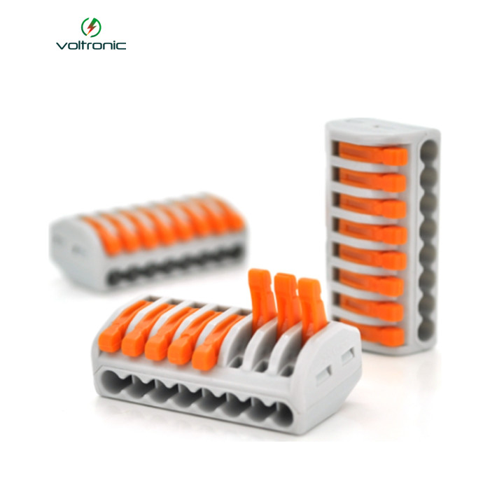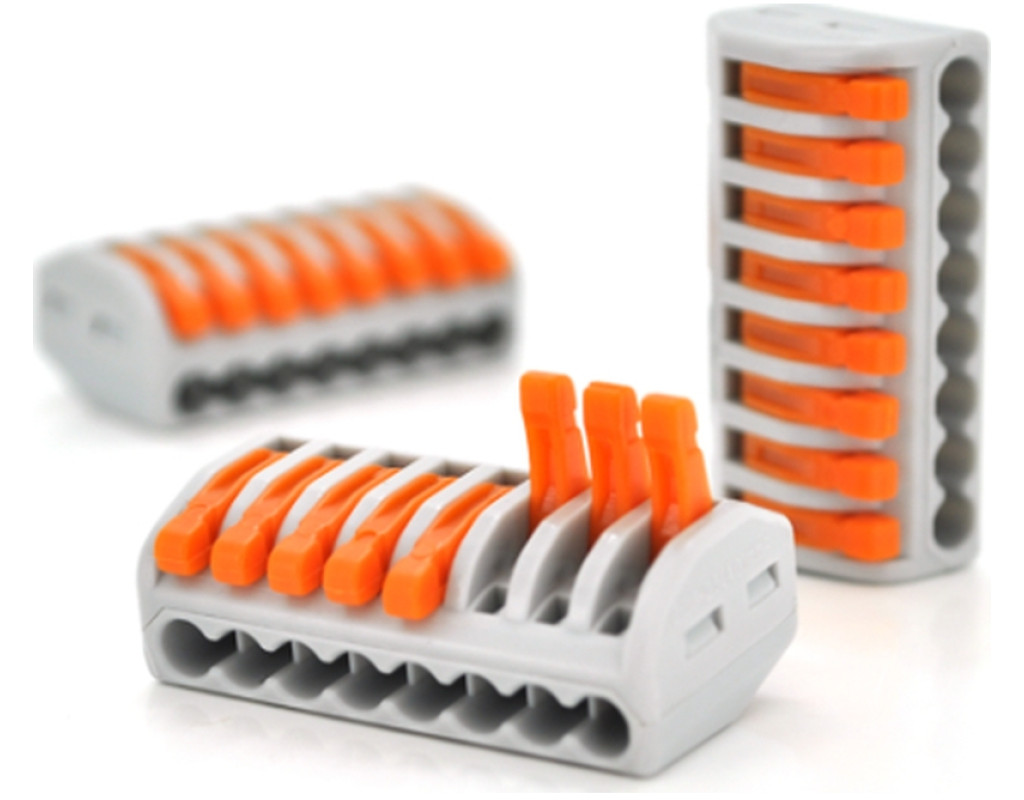 Клема з натискними затискачами 8-провідна WAGO K222-418 для розподільних коробок, 8-pin. За допомогою таких затискачів Ви зможете швидко і легко впоратися з кріпленням, встановити надійні з'єднання, які прослужать не один десяток років, і об'єднати одножильні та багатожильні кабелі. Єдиним мінусом є те, що для них потрібне додаткове місце у щитках чи розподільчих коробках. Переваги: