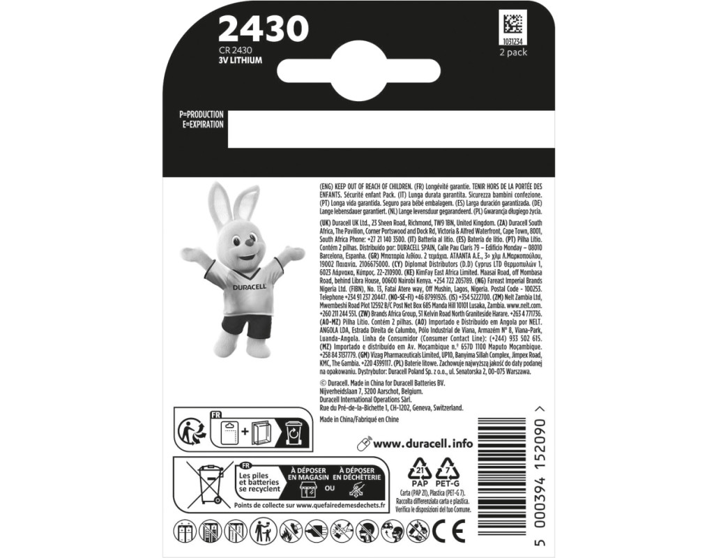Спеціальні літієві батарейки типу «таблетка» Duracell 2430 мають гарантовано довгий термін служби у ваших спеціалізованих пристроях. Для забезпечення безпеки ваших дітей вони спроектовані з упаковкою Baby Secure, яка має подвійний блістер, що важко відкрити без ножиць. Вони підходять для використання в брелоках, маленьких пультах, фітнес-годинниках та інших носимих пристроях, вагах, сенсорах, медичних пристроях (глюкометрах, цифрових термометрах), спортивних пристроях (пульсометрах, велосипедних аксесуарах). Також, з гарантією зберігання до 10 років, ви можете бути впевнені, що вони будуть готові до використання, коли вони вам знадобляться. |