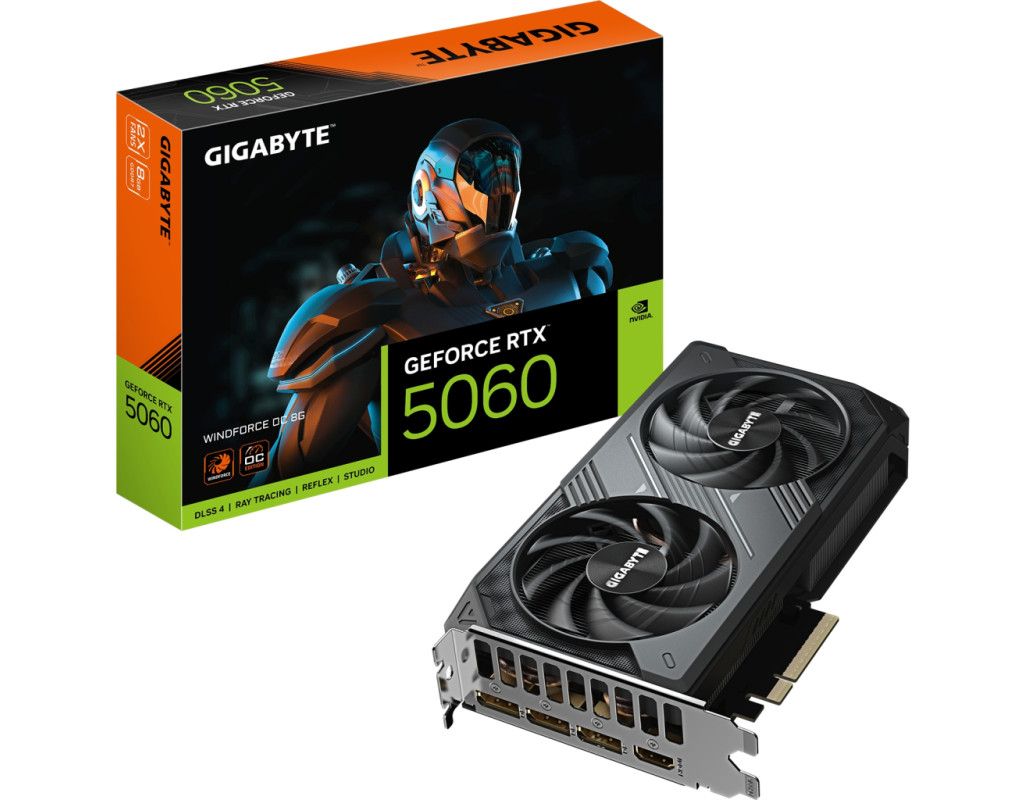 Gigabyte GeForce RTX 5060 WINDFORCE OC 8G — це потужне рішення для геймінгу та професійних задач, яке поєднує архітектуру NVIDIA Blackwell і ефективне охолодження. Завдяки 8 ГБ пам’яті GDDR7 і технології DLSS 4 вона забезпечує високу продуктивність у сучасних іграх і творчих проєктах. Ця модель вирізняється надійністю та оптимальним балансом ціни й можливостей. Особливості: - заснована на архітектурі NVIDIA Blackwell із підтримкою DLSS 4; Побудована на архітектурі NVIDIA Blackwell, використовує четверте покоління RT-ядер і п’яте покоління тензорних ядер, що забезпечують значний приріст продуктивності. Технологія DLSS 4 із підтримкою штучного інтелекту оптимізує якість графіки та частоту кадрів, дозволяючи насолоджуватися іграми з трасуванням променів навіть на високих роздільних здатностях. Це робить її ідеальною для AAA-ігор і роботи з ресурсомісткими програмами. Система охолодження WINDFORCE оснащена двома вентиляторами Hawk, дизайн яких натхненний аеродинамікою орлиного крила. Вони створюють на 53,6% більший тиск повітря та на 12,5% більший потік, забезпечуючи тиху й ефективну роботу. 3D Active Fan забезпечує напівпасивне охолодження, і вентилятори залишатимуться вимкненими, коли графічний процесор перебуває в режимі низького навантаження або низької потужності. Композитні мідні теплові трубки та серверний теплопровідний гель сприяють стабільному тепловідведенню, що дозволяє відеокарті витримувати тривалі навантаження без перегріву. Для підключення передбачені сучасні інтерфейси HDMI 2.1 і три DisplayPort 2.1, які підтримують високу роздільну здатність і частоту оновлення. Посилена конструкція плати з компонентами Ultra Durable гарантує надійність і тривалий термін служби. А Gigabyte Control Center забезпечує інтуїтивно зрозумілий інтерфейс, який дозволяє користувачам регулювати тактову частоту, напругу, режим вентилятора та цільову потужність у режимі реального часу. |