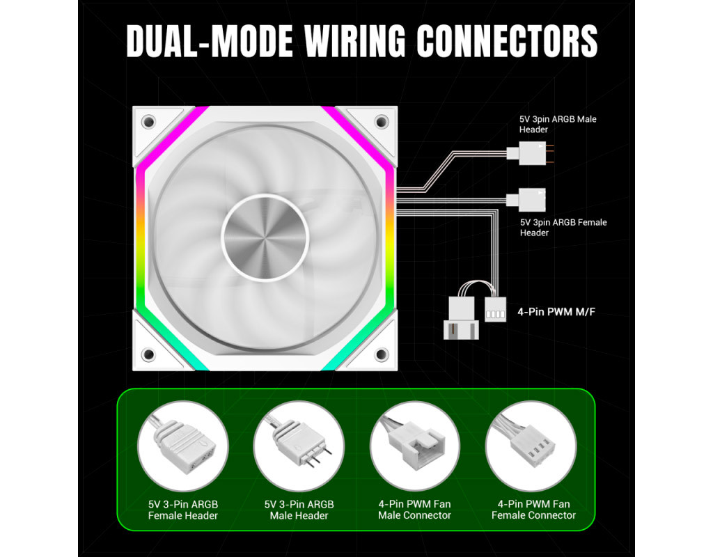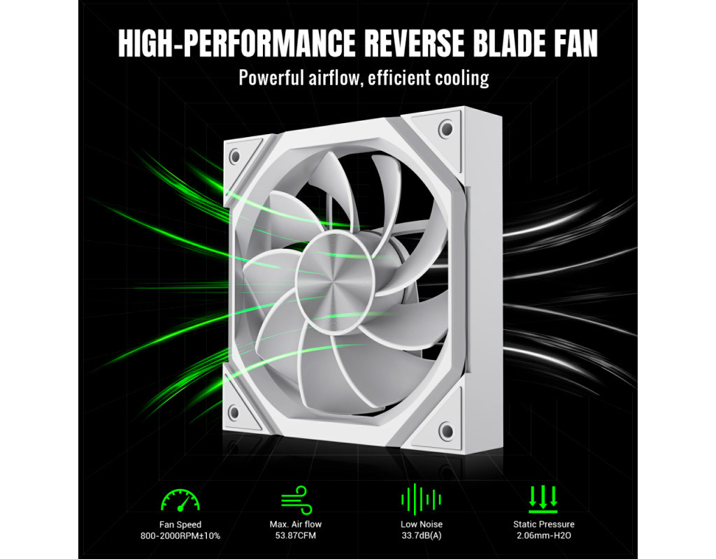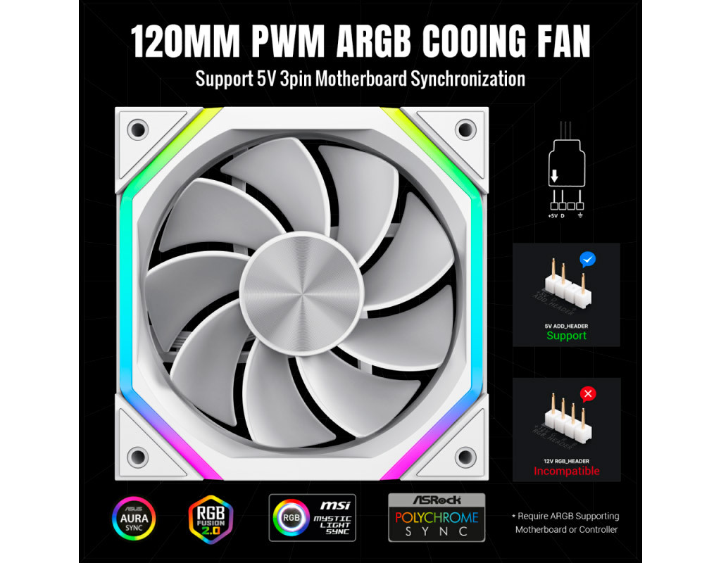 Кількість вентиляторів - 1, діаметр вентиляторів - 120 мм, тип підшипника - гідродинамічний підшипник, 2000RPM, тип роз'єму підключення - 3-pin, 4-pin, Підсвітка - ARGB, рівень шуму - 33 дБ