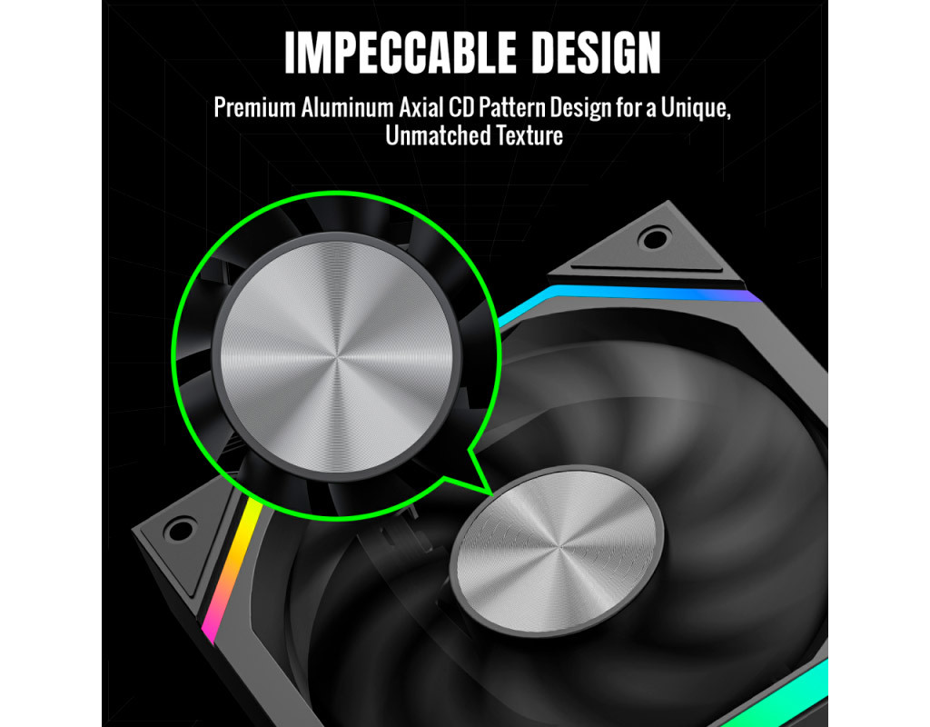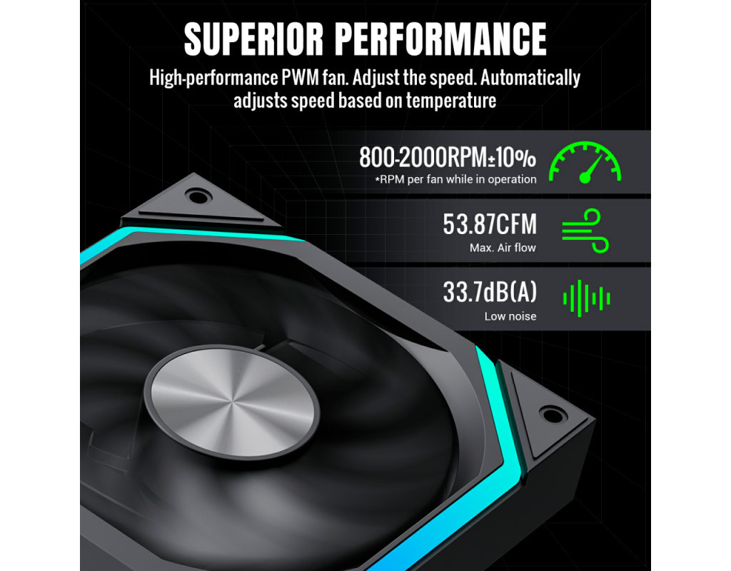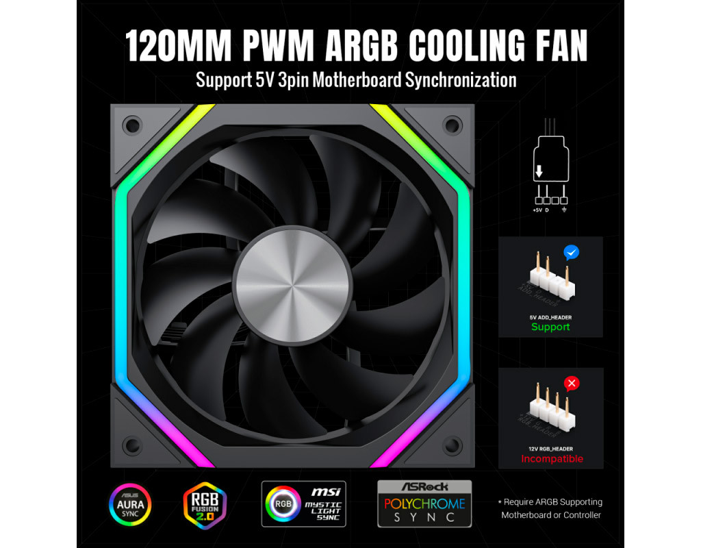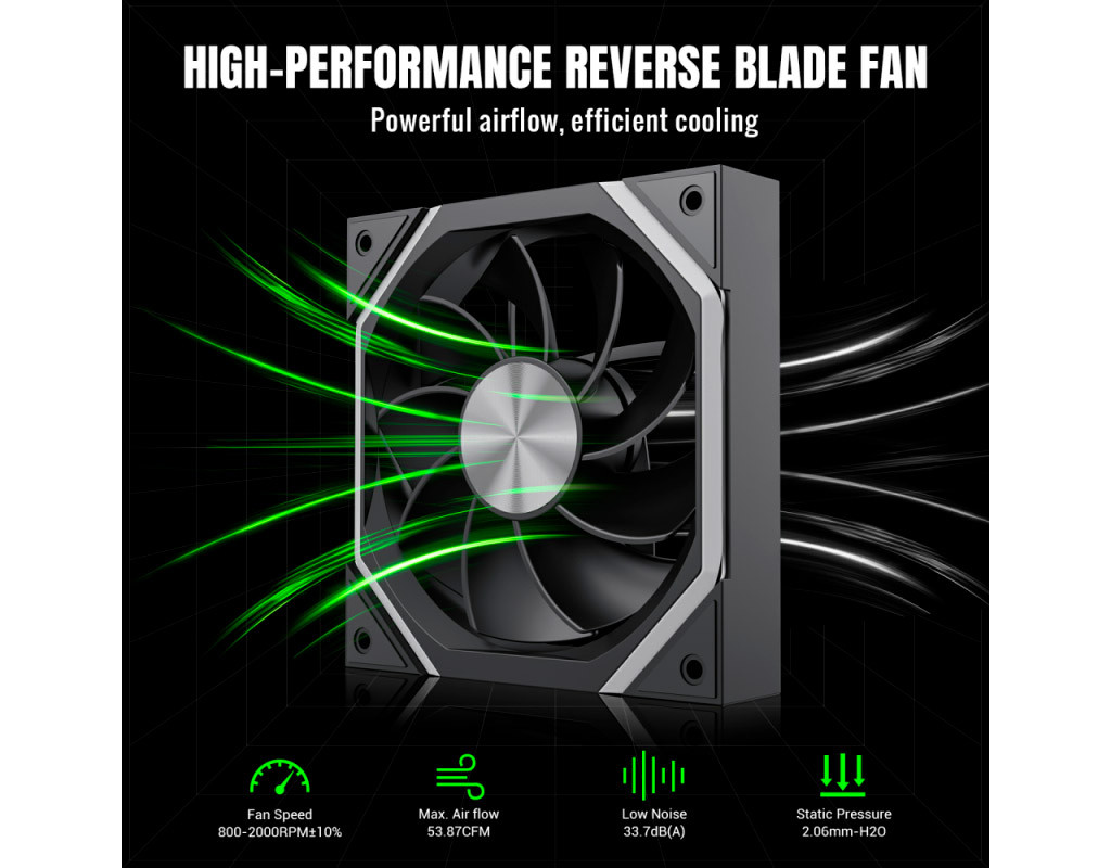Кількість вентиляторів - 1, діаметр вентиляторів - 120 мм, тип підшипника - гідродинамічний підшипник, 2000RPM, тип роз'єму підключення - 3-pin, 4-pin, Підсвітка - ARGB, рівень шуму - 33 дБ