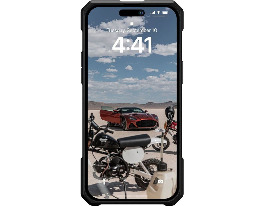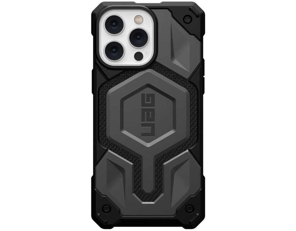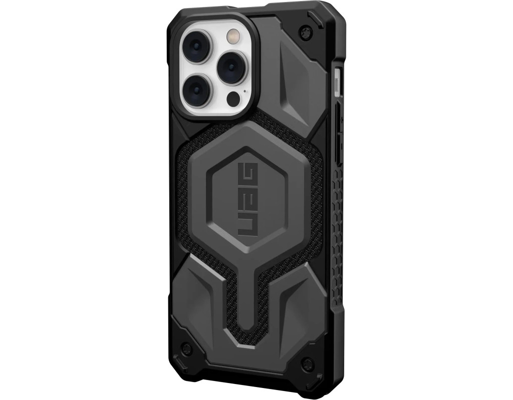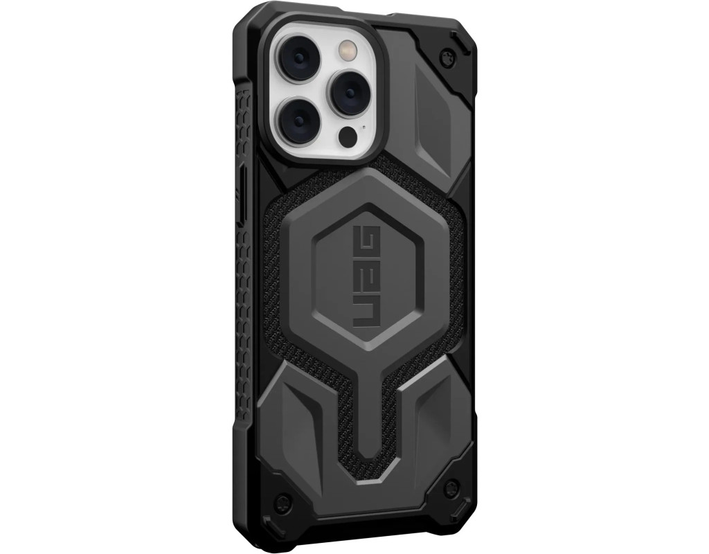 | Чохол Monarch Pro MagSafe Kevlar Series – це найміцніший із чохлів серії Monarch Pro і один з найнадійніших чохлів, доступних на ринку. У його конструкції використовується багатошарове компонування, що включає високоякісний кевлар, жорсткі полікарбонатні вставки, металеві елементи і протиударний силіконовий бампер по периметру. Така комбінація з матеріалів різної жорсткості дозволяє пристрою витримувати навіть дуже жорсткі падіння (до 6 метрів), залишаючись при цьому неушкодженим. Рифлена фактура спинки та ребер не збирає на собі відбитки, а також покращує хват у руці. Для всіх роз’ємів та камери передбачені необхідні отвори, тоді як кнопки прикриваються м’якими пило- та вологозахисними дублікаторами. У надітому стані чохол трохи виступає над рівнем лицьової панелі та тильної камери, що дозволяє класти пристрій на будь-яку рівну поверхню, без небезпеки їх подряпати. Окремо слід зазначити наявність спеціальних магнітів, впаяних у спинку, які забезпечують сумісність із бездротовими зарядками різних виробників. |
